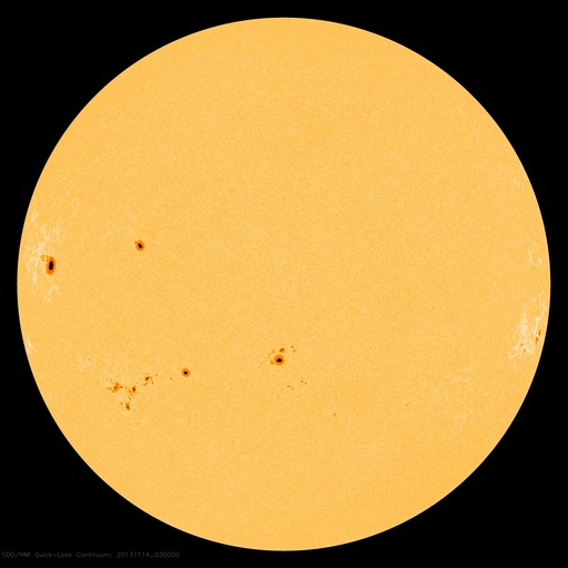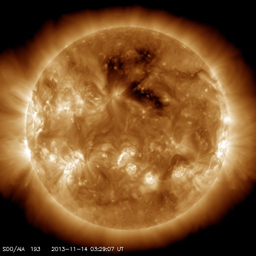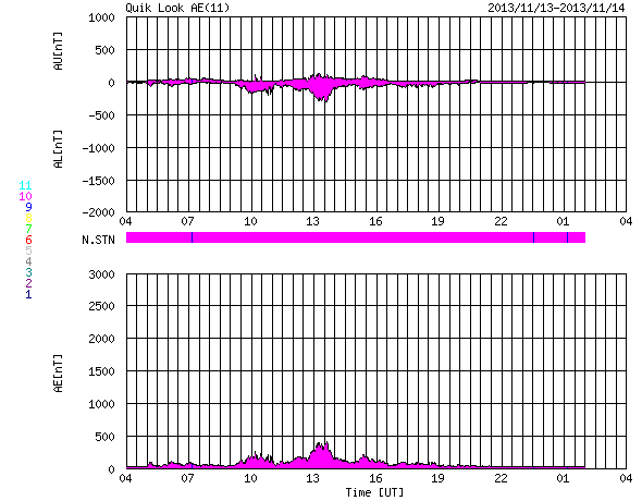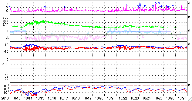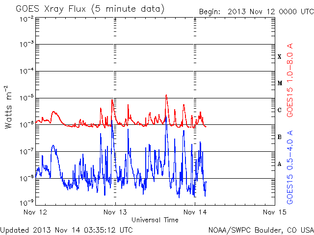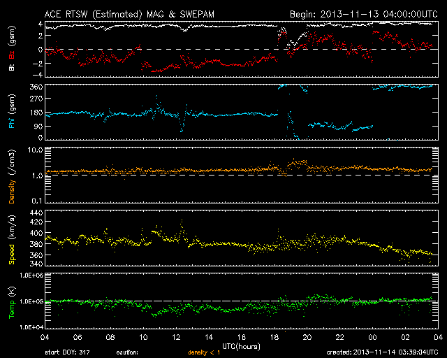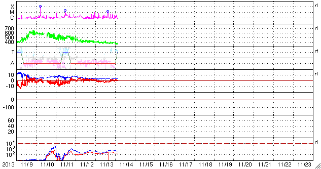 2013/11/14 12:39 更新 Cクラスのフレアが多く発生しています。太陽風は低速です。 担当 篠原 太陽では、Cクラスのフレアが活発に発生しています。 太陽南東部の1897黒点群では、 M1.4の中規模フレアを最大として、 C2.6、C5.9、C3.2などのフレアが発生し、 西の端に沈みかけている1890黒点群も、 C6.5、C2.6、C2.4、C3.5、C4.0と続いています。 また、北東の端から現れた1899黒点群も、 C2.3、C3.1などのフレアを起こしていて、 全体としてはCクラスのフレアが14回ほど発生しています。 GOES衛星のX線カメラの動画を見ていると、 太陽の右と左で次々にフレアが起きていてにぎやかです。 この後もフレアの発生が続きそうです。 太陽風は、380km/秒とやや低速の状態で安定していました。 現在はもう少し下がって、360km/秒になっています。 磁場強度も、3〜4nTとやや弱い値で安定していて、 太陽風は穏やかです。 磁気圏も概ね穏やかですが、 太陽風の磁場が南寄りだった時間帯に、 AE指数で200〜400nT程度の小さい変化が発生しています。 SDO衛星AIA193では、コロナホールが西側(右側)に進んでいます。 影響が及び始めるのは2日後くらいになりそうです。