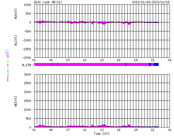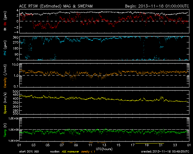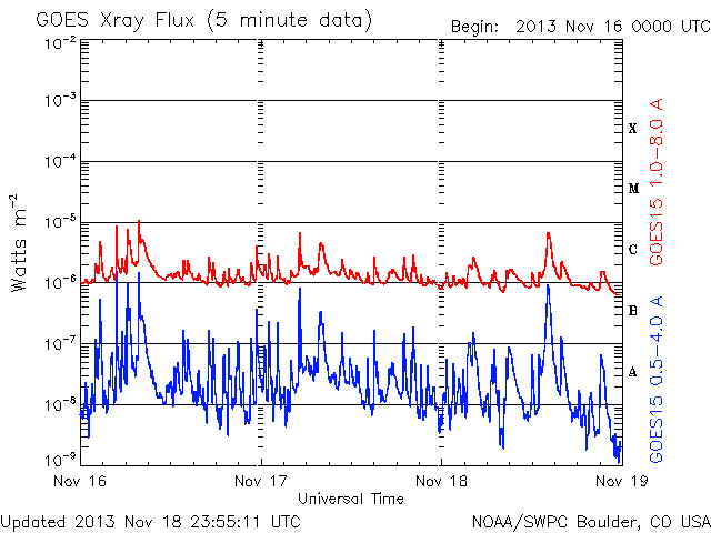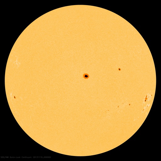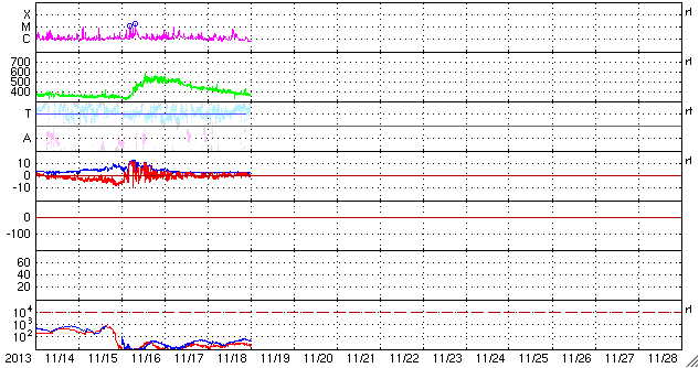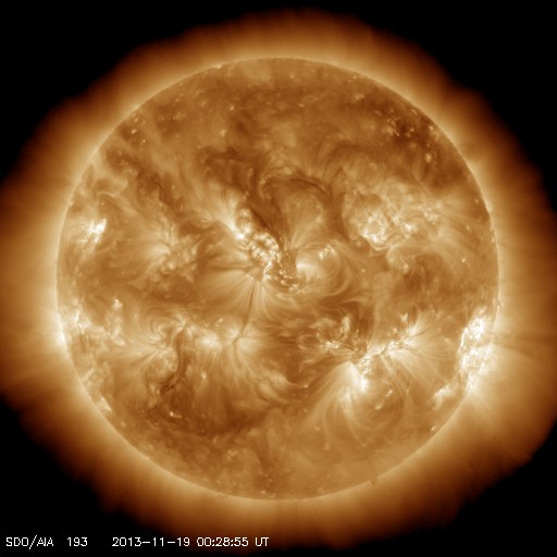 2013/11/19 09:49 更新 Cクラスのフレアが続いています。1899黒点群は肉眼で見つけられます。 担当 篠原 1899黒点群は、太陽の中心で今日も大きな姿を見せています。 鹿児島はまだ曇り空なのですが、 雲間から太陽が顔を出した時に挑戦したところ、 日食メガネで黒点を見つけることができました。 ちょうど太陽の真ん中なので、探すのも楽な様です。 これだけ大きい黒点はいつでも見られる訳ではないので (次は何年後だったということになるかもしれません)、 日食メガネなどを使って安全に、観望に挑戦して下さい。 昨夜、18日22時半(世界時18日13時半)に、 1893黒点群でC7.0と大きめの小規模フレアが発生し、 その他に、1897、1893、1900などの黒点群で、 C1〜3程度のフレアが10回程度起きています。 フレアの頻度は高いのですが、 大きい現象は少なくなっている印象です。 また、活発にフレアを起こしていた黒点群たちは 次第に西の端に近づいていて、もう3日ほど経つと、 太陽は穏やかになるかもしれません。 太陽風は更に速度が下がり、360km/秒と低速の風に変わっています。 磁場強度も2〜3nTと弱まった状態です。 磁気圏は概ね静穏で、 AE指数は、100nTの小さい変化が記録されているくらいです。 SDO衛星AIA193には、コロナホールは見られず、 しばらく低速の穏やかな太陽風が続きそうです。