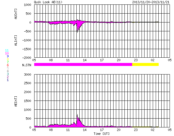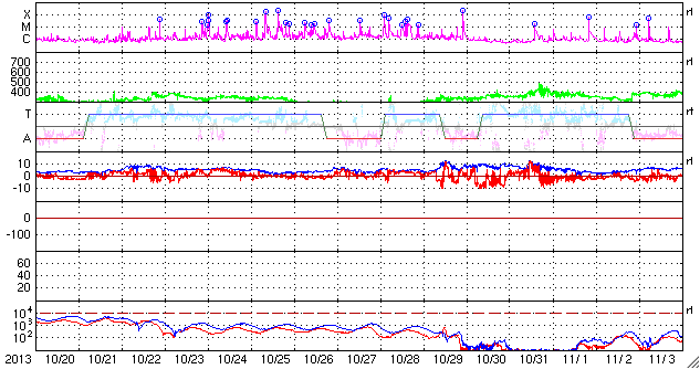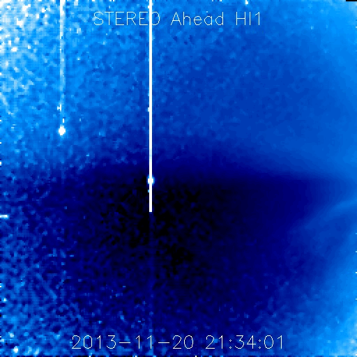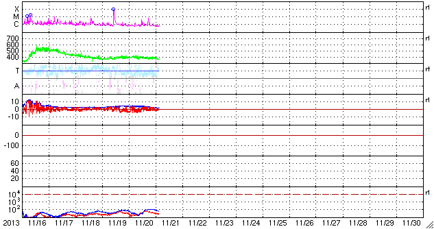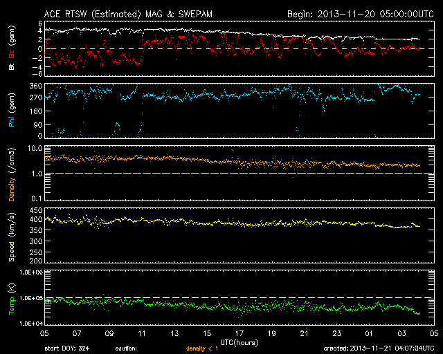 2013/11/21 13:07 更新 太陽の活動は落ち着きそうです。STEREO衛星でアイソン彗星が見えています。 担当 篠原 夜明け前の東の空に、アイソン彗星が現れています。 国立天文台の解説ページで、 この彗星の特徴や観望の方法が紹介されています。 私も晴れた朝に早起きして2回ほど観望しました。 今朝は5cmの双眼鏡を使ったのですが、 彗星のぼんやりした頭を見つけることができました。 アイソン彗星は、来週、11月29日に太陽に最接近します。 どんどん太陽に近づくため、 地上からの観測は次第に難しくなりますが、 太陽観測衛星による観測のチャンスがやって来ます。 既にSTEREO Ahead衛星の広視界カメラであるHI2で、 彗星の様子を見ることができます。 1枚目の動画は、11月8日以降の彗星の様子です。 ゆらゆらと尾を太陽風にたなびかせながら彗星が太陽に向かっています。 STEREO衛星のページでは、アイソン彗星の見え方を紹介しています。 これによると、STEREO AheadのHI1でも彗星が見え始める頃です。 現時点の最新写真と予想画像を組み合わせて動画を作りました。 写真の左端に細長く見えている光は、 登場したばかりの彗星かもしれません。 今後は、Behind衛星や、 最接近前後はCOR2などのカメラでも見ることができます。 そして、SOHO衛星のページでも、観測予想図が公開されています。 11月27日頃にLASCO C3に見え始めて、30日頃に出て行くそうです。 アイソン彗星は、太陽に非常に近づくため、 とても明るくなったり、長い尾が現れるなど、 大きく変化する可能性があります。 太陽観測衛星を使って彗星を眺めるという、 宇宙天気ならではの楽しみ方で、 来週に向けて注目度を上げてみて下さい。 太陽では、南西の1897黒点群で、 C4.6、C6.4とやや大きいCクラスのフレアが発生しています。 その一方、可視光写真を見ると、 1897黒点群はすっかり小さくなっていて、 そろそろ消えてしまいそうです。 1899黒点群は大きな姿を保っていますが、 その他の黒点群はどれも小さく、太陽の活動は穏やかになりそうです。 太陽風は、再び速度が低下して、370km/秒とやや低速の状態です。 磁場強度は、4nTから2nTへ弱まっています。 磁気圏は全体としては静穏ですが、 AE指数の図の真ん中にひとつだけ、 700nTに達するやや大きい変化が発生しています。 太陽風は穏やかなので、磁気圏も静穏な状態が続くでしょう。 ![]() STEREO Ahead衛星HI2カメラによる、11月8日以降のアイソン彗星の太陽接近の様子。 (c) STEREO (NASA)、 (動画加工 : 宇宙天気ニュース) ![]() STEREO Ahead衛星HI1カメラの左端の細長い光は、アイソン彗星かもしれません。予想図と交互に。 (c) STEREO (NASA) ![]() SDO衛星のAIA193カメラによる太陽コロナの様子 (c) SDO (NASA) ![]() SDO衛星による太陽の可視光写真。マウスの矢印を写真に重ねると、黒点番号付きの写真に切り替わります。 (c) SDO (NASA) ![]() GOES衛星の太陽X線データ (c) NOAA/SWPC ![]() ACEが観測した太陽風の磁場(1番上の枠、白線は全体の強度、赤線は南北成分) および、太陽風の密度(3番目の橙線)、速度(4番目の黄線) (c) NOAA/SWPC ![]() リアルタイムAE指数 下段のAEグラフの値が高くなると、オーロラ活動が活発化しています。 (c) 京都大学, NICT ![]() 27日の太陽周期に合わせたデータプロット 太陽が同じ面を地球に向けていた27日前の変化から、今後を予想することができます。 (c) 作図:宇宙天気ニュース