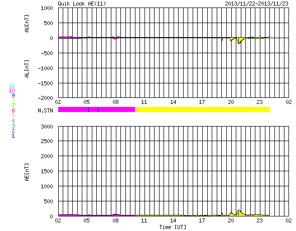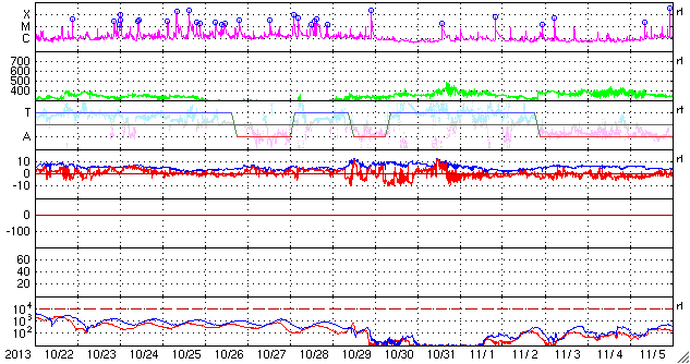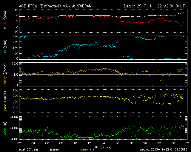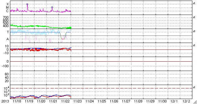 (c) 篠原学 ![]() 11月23日朝の東の空のアイソン彗星(右)と水星(左)。 (c) 篠原学 ![]() STEREO AheadのHI2、HI1によるアイソン彗星。 (c) STEREO (NASA)、 (動画加工 : 宇宙天気ニュース) ![]() SDO衛星のAIA193カメラによる太陽コロナの様子 (c) SDO (NASA) ![]() SDO衛星による太陽の可視光写真。マウスの矢印を写真に重ねると、黒点番号付きの写真に切り替わります。 (c) SDO (NASA) ![]() GOES衛星の太陽X線データ (c) NOAA/SWPC ![]() ACEが観測した太陽風の磁場(1番上の枠、白線は全体の強度、赤線は南北成分) および、太陽風の密度(3番目の橙線)、速度(4番目の黄線) (c) NOAA/SWPC ![]() リアルタイムAE指数 下段のAEグラフの値が高くなると、オーロラ活動が活発化しています。 (c) 京都大学, NICT ![]() 27日の太陽周期に合わせたデータプロット 太陽が同じ面を地球に向けていた27日前の変化から、今後を予想することができます。 (c) 作図:宇宙天気ニュース