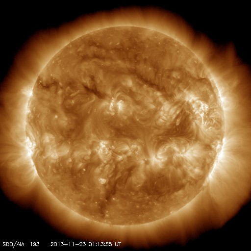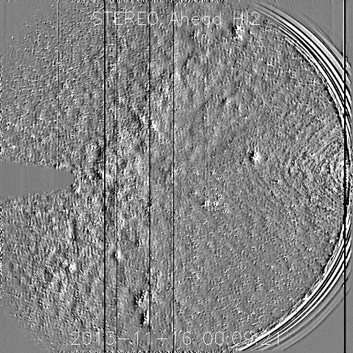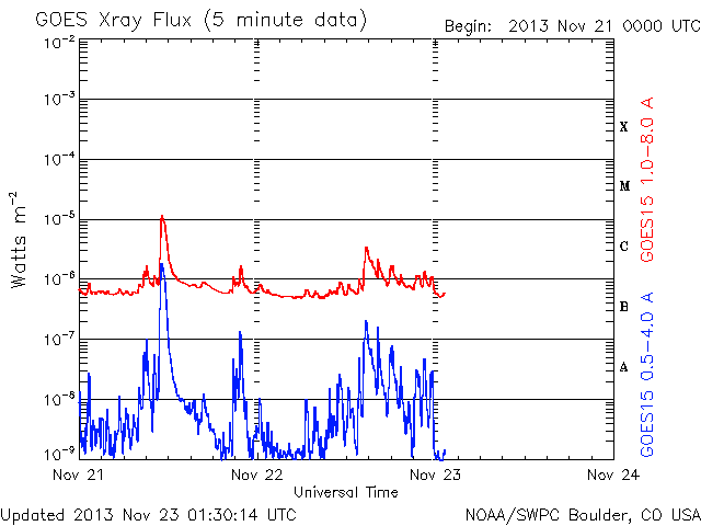 2013/11/23 10:34 更新 太陽の東端でCクラスフレアが起きています。今朝のアイソン彗星の写真をどうぞ。 担当 篠原 今朝の鹿児島はとても良い天気で、 5時半から6時にかけてアイソン彗星を撮影することができました。 望遠鏡による拡大写真と、望遠レンズによる少し広い写真を掲載します。 今回は撮影が忙しくて、じっくり眺める時間がなかったのですが、 空の透明度が高かったため、 低い高度の割に双眼鏡でも簡単に見つけることができました。 アイソン彗星はだいぶ太陽に近づいているため、 空が明るくなるのも早く、 撮影枚数を重ねるにつれて空がぐんぐん明けていくのを感じました。 STEREO Ahead衛星によるアイソン彗星の動きも紹介します。 太陽最接近まであと9日です。 太陽は、昨夜より今朝にかけて、 東の端の南北でC1〜3の小規模フレアが5回発生しています。 活動的な領域がここにあるようで、 可視光写真では白斑など一部が見えています。 太陽風は、低速の風が続いていますが、 ACEの速度データが280〜350km/秒の範囲で変動していて、 正しい状況が分かりません。 磁場強度は4nTから6nTに少し上がった程度です。 磁気圏は静穏で、AE指数はほとんど変化していません。