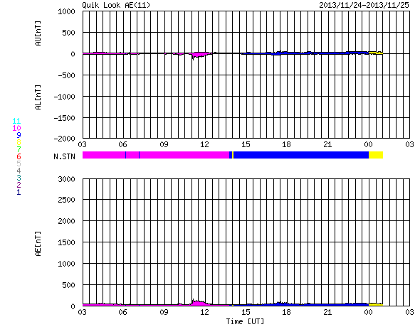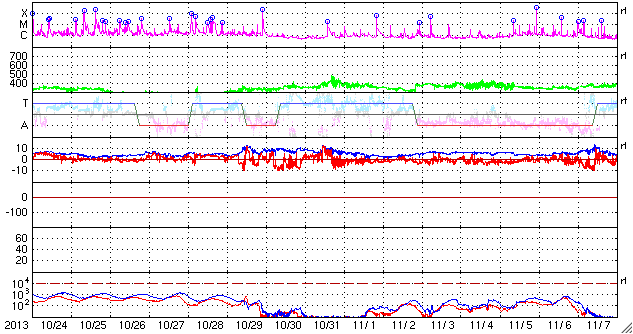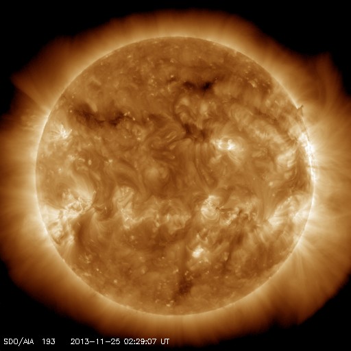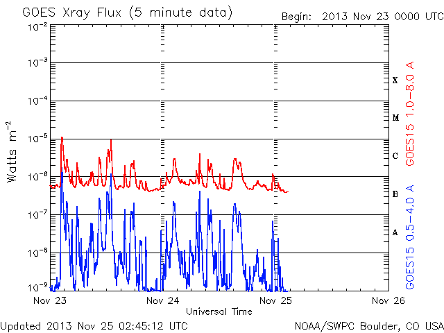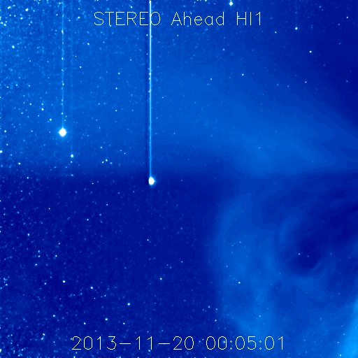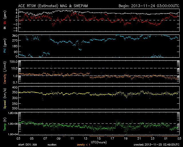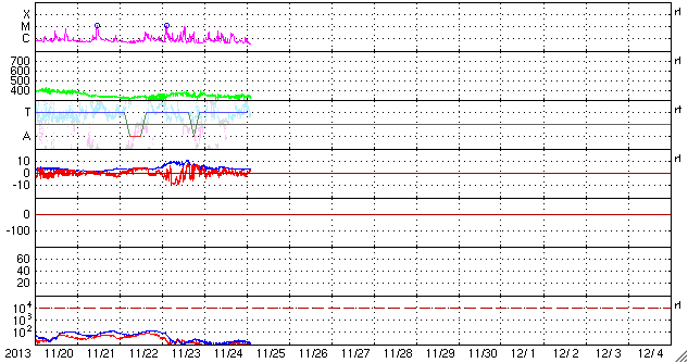 2013/11/25 11:49 更新 太陽はCクラスのフレアが続きましたが、今後は静かになりそうです。太陽風は低速です。 担当 篠原 アイソン彗星が次第に太陽に近づいています。 STEREO Ahead衛星のHi1カメラの様子を掲載します。 前半の高画質写真では、 左端からアイソン彗星が入ってくる様子と、 その前方に小さく、エンケ彗星も見えています。 後半の低画質部分も今後の更新が楽しみです。 太陽のフレアは、西の端に没しかけている1904黒点群で、 C1〜4のフレアが9回ほど発生しています。 1904群は、1899群とともに見えなくなってしまうので、 この後、太陽は静かになりそうです。 太陽風は、350km/秒と低速の状態で安定しています。 磁場強度も4nTでほとんど変化はありません。 磁場の南北成分は、0nT付近から比較的北寄りで推移しています。 このため磁気圏は静穏で、AE指数はほとんど変化していません。 SDO衛星AIA193の太陽コロナ写真にはコロナホールは特に見られず、 太陽風は穏やかな状態が続きそうです。 ![]() STEREO Ahead衛星HI1カメラを通過中のアイソン彗星。 (c) STEREO (NASA)、 (動画加工 : 宇宙天気ニュース) ![]() SDO衛星のAIA193カメラによる太陽コロナの様子 (c) SDO (NASA) ![]() SDO衛星による太陽の可視光写真。マウスの矢印を写真に重ねると、黒点番号付きの写真に切り替わります。 (c) SDO (NASA) ![]() GOES衛星の太陽X線データ (c) NOAA/SWPC ![]() ACEが観測した太陽風の磁場(1番上の枠、白線は全体の強度、赤線は南北成分) および、太陽風の密度(3番目の橙線)、速度(4番目の黄線) (c) NOAA/SWPC ![]() リアルタイムAE指数 下段のAEグラフの値が高くなると、オーロラ活動が活発化しています。 (c) 京都大学, NICT ![]() 27日の太陽周期に合わせたデータプロット 太陽が同じ面を地球に向けていた27日前の変化から、今後を予想することができます。 (c) 作図:宇宙天気ニュース