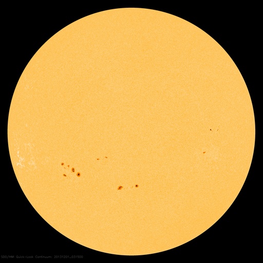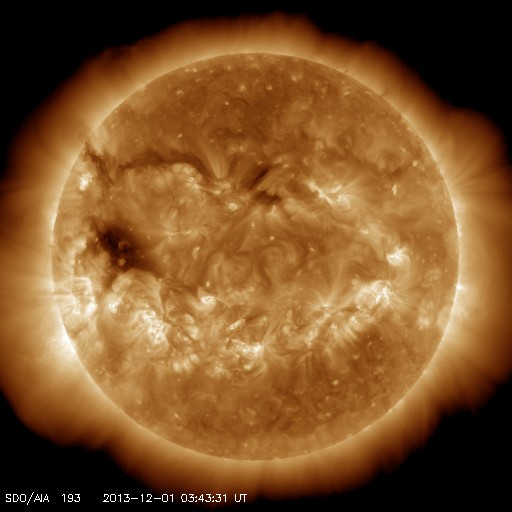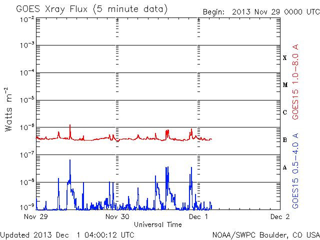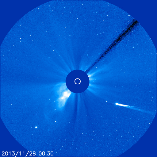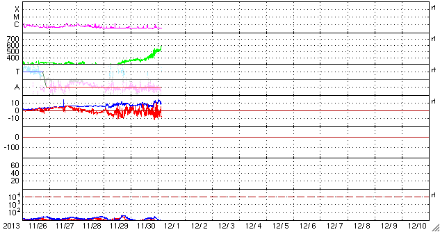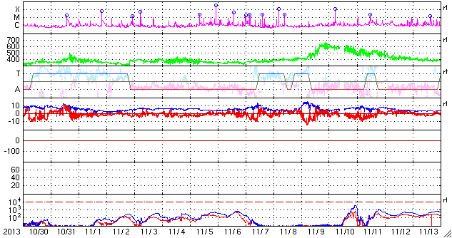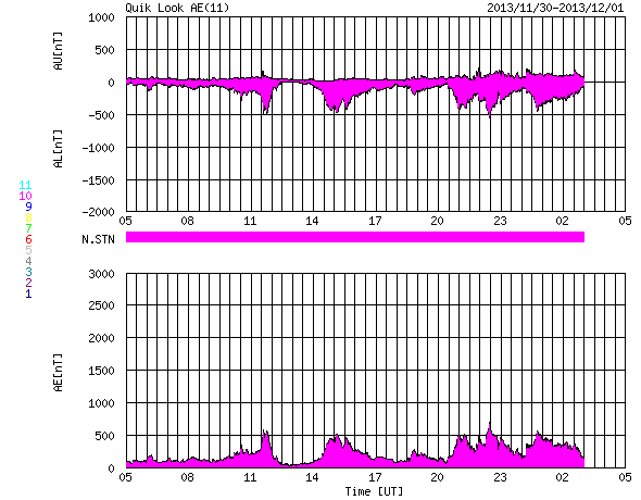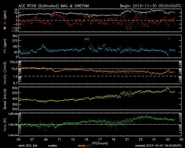 2013/12/ 1 13:04 更新 アイソン彗星は消えかけています。ムルマンスクのオーロラをどうぞ。 担当 篠原 アイソン彗星がSOHO衛星LASCO C3からも去ろうとしています。 今日の写真では彗星は一段と淡くなっていて、 ほとんど消えようとしています。 残念ですが、このまま消滅してしまいそうな様子です。 この動画では、30日にもCMEの噴出が起きていますが、 いずれも太陽の裏側で起きた現象です。 地球への影響はありません。 その太陽では、1909黒点群が成長したり、 その右上に1911群が発生したりしていますが、 C1.0のフレアが1回と、 その他にBクラスの小さいフレアが起きている程度です。 1909黒点群は、成長とともにフレア活動を強めたりするでしょうか。 太陽風は、今日に入った頃から速度が再び上がり始め、 380km/秒とやや低速だったのが、 現在は500km/秒台の高速風に変わっています。 ACEのグラフでは、一時的に600km/秒に届く変化も起きています。 磁場強度も10nTに上がっていて、 しっかりとした高速太陽風の領域が到来している様です。 27日周期の図では、前周期は穏やかな太陽風が続いていた期間ですが、 更にさかのぼると、この頃はコロナホールによる高速太陽風が 繰り返しやって来ていた期間でした。 現在の太陽ではコロナホールは特に見られなかったのですが、 高速風を作る構造は残っていたのかもしれません。 磁場強度が高まった状態にあるため、 この後に、もう一段速度が高まるかもしれません。 引き続き太陽風の変化に注目して下さい。 太陽風の強まりを受けて、AE指数の変化も続いています。 今日のグラフでも500nTの中規模の変化が続いています。 極域ではオーロラの活動が楽しめているのではないでしょうか。 昨日のニュースの図でもAE指数が変動をしていましたが、 その頃のオーロラの写真を、 ロシア、ムルマンスクの福島さんよりいただきました。 1枚目は29日の夜にムルマンスク上空に現れたオーロラです。 現在は降雪シーズンだそうで、 見ることができたのはラッキーだったとのことです。 住宅の上にオーロラが輝いています。 このような生活感のある写真は見ていて楽しいですね。 そして、2枚目は、同じ夜にムルマンスクの西の ノルウェーに近い軍事閉鎖都市ニーケリ市で撮影されたオーロラです。 軍事閉鎖都市というのは、 外国人立ち入り禁止などの制限が行われている場所だそうです。 そう考えると、一層貴重な一枚に感じます。 どうもありがとうございました。 ムルマンスクでは29日から寒気をもたらす冬将軍が来ているそうです。 鹿児島もこの週末は寒くなっていますが、子ども程度ですね。 ![]() SOHO衛星LASCO C3による、アイソン彗星の太陽接近の様子。 (c) SOHO (ESA & NASA)、 (動画加工 : 宇宙天気ニュース) ![]() 11月29日にムルマンスク市上空に現れたオーロラ。 (c) 福島留美氏、ジャヴァランコフ・コンスタンチン氏(撮影) ![]() 11月29日にムルマンスク市西方のニーケリ市に現れたオーロラ。 (c) 福島留美氏、テレシェンコフ・アナトリー氏(撮影) ![]() SDO衛星のAIA193カメラによる太陽コロナの様子 (c) SDO (NASA) ![]() SDO衛星による太陽の可視光写真。マウスの矢印を写真に重ねると、黒点番号付きの写真に切り替わります。 (c) SDO (NASA) ![]() GOES衛星の太陽X線データ (c) NOAA/SWPC ![]() ACEが観測した太陽風の磁場(1番上の枠、白線は全体の強度、赤線は南北成分) および、太陽風の密度(3番目の橙線)、速度(4番目の黄線) (c) NOAA/SWPC ![]() リアルタイムAE指数 下段のAEグラフの値が高くなると、オーロラ活動が活発化しています。 (c) 京都大学, NICT ![]() 27日の太陽周期に合わせたデータプロット 太陽が同じ面を地球に向けていた27日前の変化から、今後を予想することができます。 (c) 作図:宇宙天気ニュース