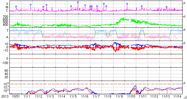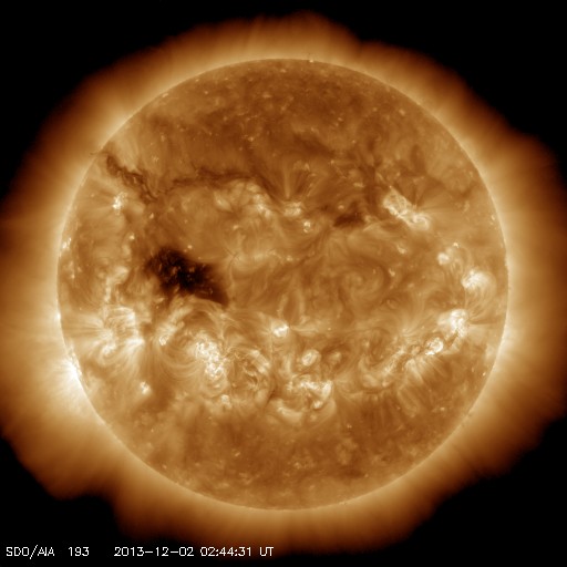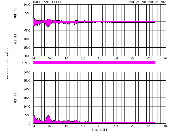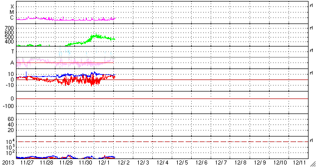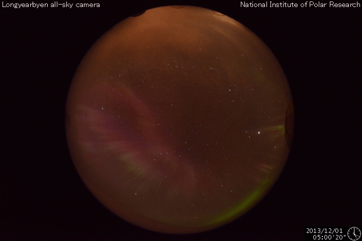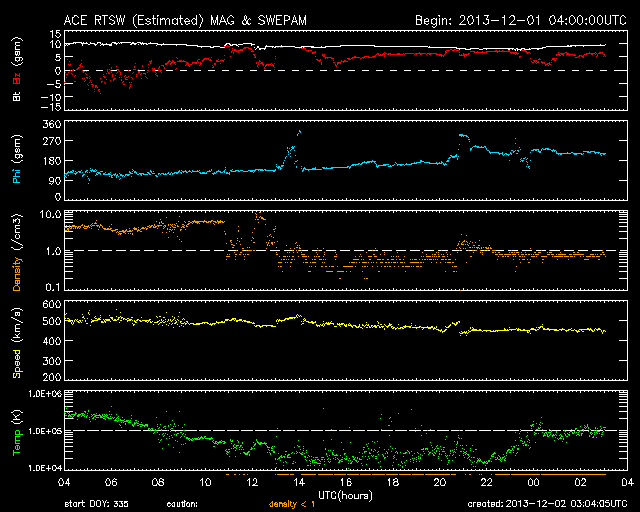 2013/12/ 2 12:05 更新 太陽風は450km/秒とやや高速です。太陽も比較的穏やかです。 担当 篠原 太陽風の速度は、 昨日のニュース以降500km/秒以上に上がることはなく、 次第に下がって、現在は450km/秒とやや高速の状態です。 一方、磁場強度は、10nTに高まったままで安定しています。 太陽風の強まりとしては、後半に入っているのでしょうか。 太陽風磁場の南北成分は、 ACEの図の初めの頃までは南寄りでしたが、 以降、北向きに変わっています。 このため、磁気圏の活動も、 AE指数のグラフの最初に500nTくらいの変化が起きていますが、 以降は全く変化がなくなっています。 この最初の頃のオーロラの様子を、北極海の島、 スバールバル島のLongyearbyenの全天カメラで紹介します。 SDO衛星AIA193では、 太陽の中心部の東寄りにコロナホールが見えています。 4〜5日ほど経つと、この領域の影響による高速太陽風が やって来る可能性があります。 太陽は、南東の端と北西部でC1の小さいフレアが発生した程度で、 全体としては穏やかです。 黒点群はいくつもあり、 小さい変動はそれぞれ起きているのですが、 目立つ規模には達していません。