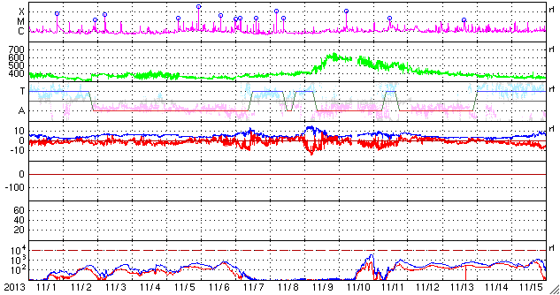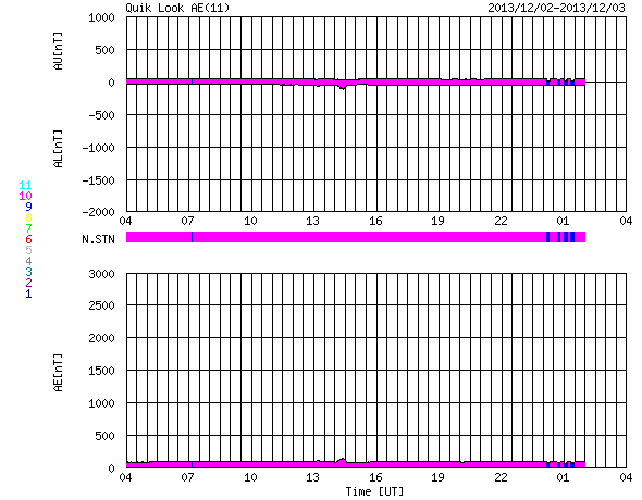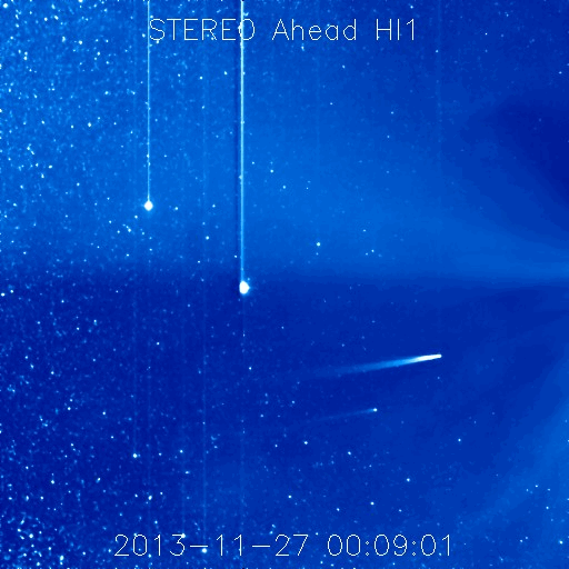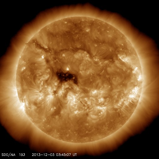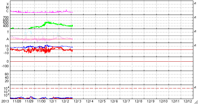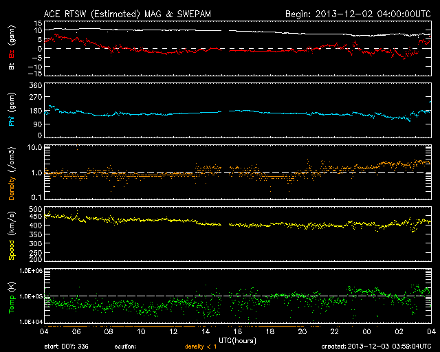 2013/12/ 3 12:59 更新 太陽風は平均的な速さに戻りました。太陽も穏やかです。 担当 篠原 STEREO Ahead衛星HI1カメラによる、 アイソン彗星の太陽通過前後の様子を紹介します。 30日まで高解像度の写真になったので、 接近後の彗星もきれいに見えていますが、 その姿はとても淡くなっています。 太陽風は、450km/秒から400km/秒に速度が下がり、 平均的な状態に戻っています。 磁場強度も10nTから7nTくらいに下がり、 やや強まっているくらいです。 今回の太陽風の高まりは終わりつつあるようです。 磁気圏の活動は静穏で、AE指数は全く変化していません。 太陽風は一旦穏やかになり、 次の変化は、今日のSDO衛星AIA193の中心部に見える コロナホールの影響になりそうです。 今日の写真で中央に達しつつあるので、 3〜4日後くらいに変化が到来する可能性があります。 太陽は、C1〜2の小規模フレアが2回発生した程度で、 全体としては穏やかです。