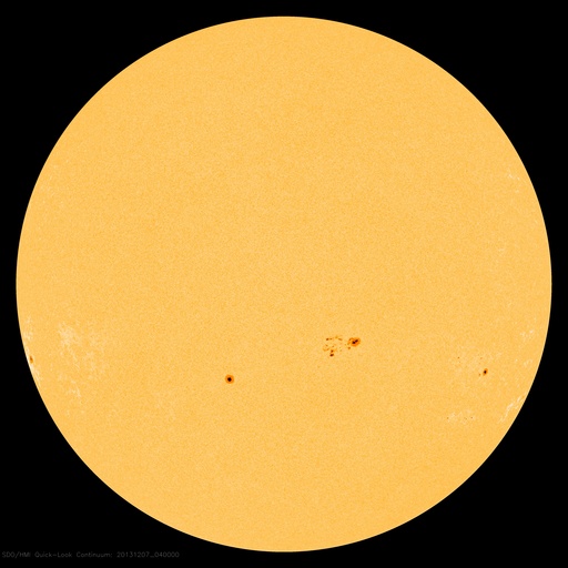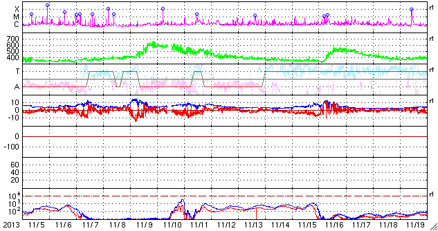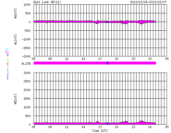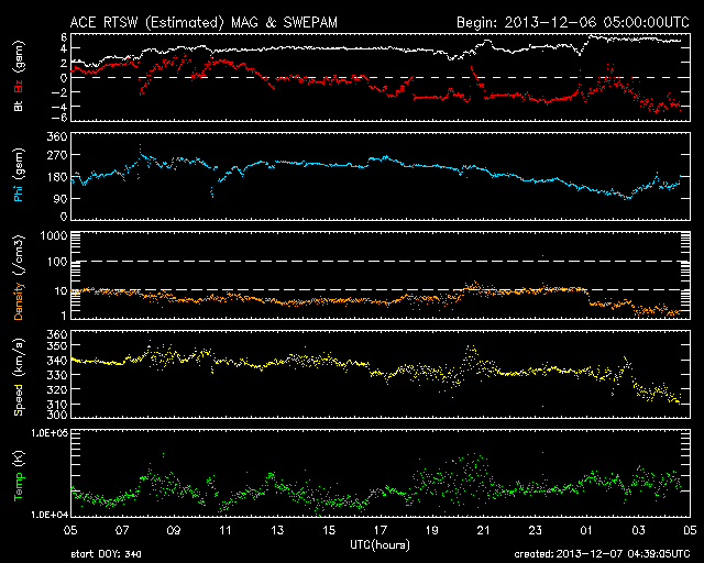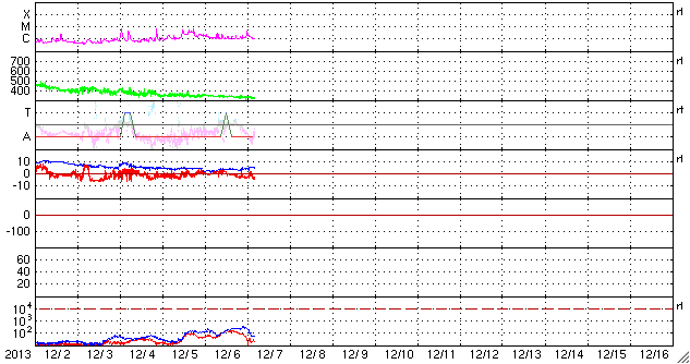 2013/12/ 7 13:39 更新 太陽風は低速風が続いています。太陽ではCクラスのフレアが続いています。 担当 篠原 太陽風の速度は、昨日から今朝にかけて、 340km/秒から330km/秒へゆっくりと下がり、 今日の昼頃にもう一段下がって、 310km/秒とかなり遅い風になっています。 磁場強度は、2nTから5nTへ上がっていますが、 平均的な強さに戻った程度の変化です。 高速太陽風の到来が近いのではと考えていましたが、 反対に、低速の穏やかな太陽風が続いています。 SDO衛星AIA193では、 コロナホールは太陽の西側(右側)にだいぶ移動しています。 影響の到来は遅れているのか、このまま来ないのか、 引き続き注目してください。 太陽風は穏やかですが、磁場の南北成分は ACEのグラフの後半から南向きに振れています。 このため、AE指数の変化としては小さいですが、 弱い磁気圏活動が発生していています。 太陽では、C1〜4の小規模フレアが、東端で発生しています。 可視光写真では、黒点群が顔を出していますが、 この領域で発生しているのでしょうか。 こちらも今後の活動に注目してください。