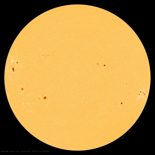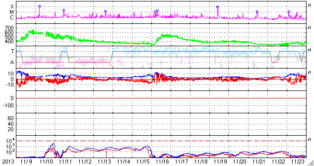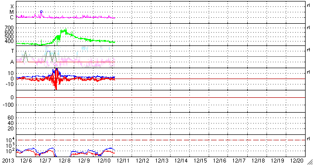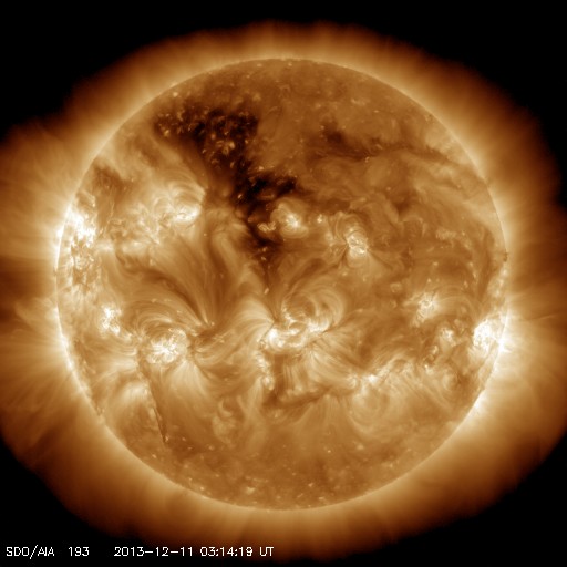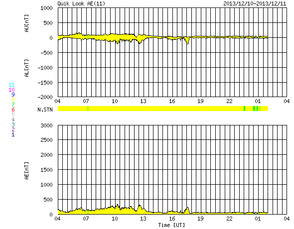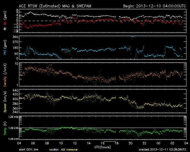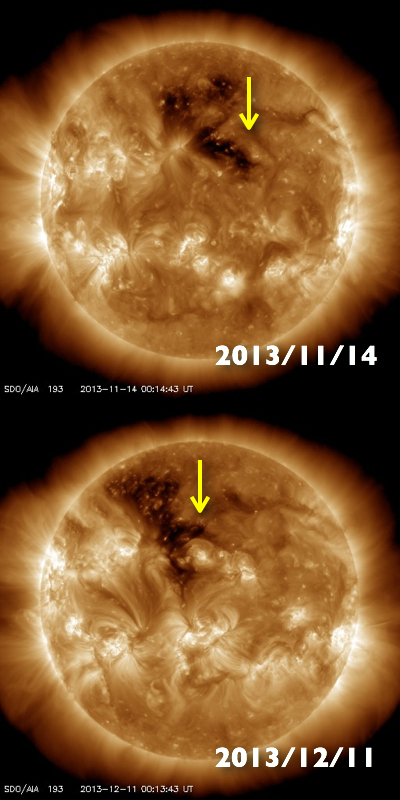 2013/12/11 12:29 更新 太陽風は低速になりつつあり、磁気圏も静かです。 担当 篠原 SDO衛星AIA193の太陽コロナ写真の北半球側で、 コロナホールが太陽の中心線に達しています。 このコロナホールの位置を、27日前の写真と比べてみます。 すると、27日前の11月14日には、 コロナホールは既に中心線を越えて、 太陽の西側にせり出していました。 27日周期の図で、その後の太陽風の変化を見ると、 2日後の11月16日から、速度の高まりが発生しています。 今回、コロナホールの進み方が一日分ほど遅れていると考えると、 太陽風変化の到来も一日遅れて、 3日後の14日頃になるかもしれません。 今週の後半にかけて、 太陽風変化の到来のタイミングに注目して下さい。 現在の太陽風は、速度(ACEのグラフの黄色線)がもう一段下がって、 370km/秒と低速の風に変わりつつあります。 磁場強度(白線)は3〜4nTとやや弱まっています。 太陽風磁場の南北成分(赤線)は、 グラフの前半では、 昨日の続きで南向き(マイナス向き)に振れていますが、 その後は0nT付近で変化するようになっています。 磁気圏の変化もこれに合わせて、 AE指数の前半には小規模の変化が発生していますが、 以降は静かになっています。 太陽風の速度が下がってきていることもあり、 今後の磁気圏の活動は、弱い変化になりそうです。 太陽は、東半球から黒点群が次々と現れて、 賑やかになっています。 しかし、目立ったフレアの発生はなく、 C1からC2の小さい変化が数回発生した程度です。 東端の向こう側には、まだ新しい活動領域があるようです。 既に現れている黒点群とともに、活動の様子に注目して下さい。 ![]() SDO衛星のAIA193カメラによる、27日前のコロナホールとの比較。 (c) SDO (NASA)、作図:宇宙天気ニュース ![]() SDO衛星のAIA193カメラによる太陽コロナの様子 (c) SDO (NASA) ![]() SDO衛星による太陽の可視光写真。マウスの矢印を写真に重ねると、黒点番号付きの写真に切り替わります。 (c) SDO (NASA) ![]() ACEが観測した太陽風の磁場(1番上の枠、白線は全体の強度、赤線は南北成分) および、太陽風の密度(3番目の橙線)、速度(4番目の黄線) (c) NOAA/SWPC ![]() リアルタイムAE指数 下段のAEグラフの値が高くなると、オーロラ活動が活発化しています。 (c) 京都大学, NICT ![]() 27日の太陽周期に合わせたデータプロット 太陽が同じ面を地球に向けていた27日前の変化から、今後を予想することができます。 (c) 作図:宇宙天気ニュース
