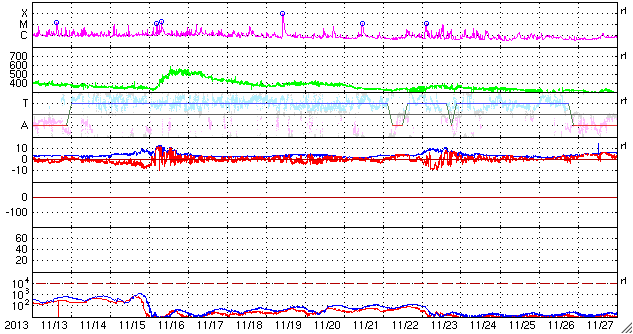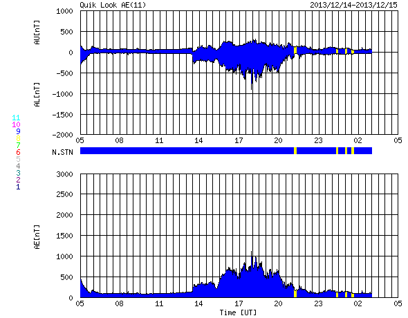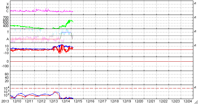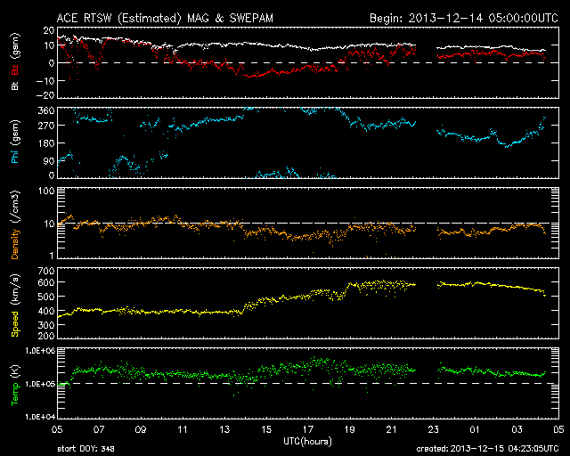 2013/12/15 13:23 更新 太陽風は600km/秒の高速風になりました。 担当 篠原 昨夜から、本格的な高速の太陽風がやって来ました。 14日23時(世界時14日23時)頃から上昇が始まり、 6時間程で、600km/秒の高速風になりました。 速度の高まりとしては、 前周期よりも一段大きくなっています。 磁場強度は、10nTに強まった状態が続いています。 南北成分は、ゆっくりと変化していますが、 磁場強度が強まっているため、 振れ幅は大きくなっています。 そのため、南向きに振れた時間帯に、 オーロラの活動が強まり、 AE指数で、800nT程度の中規模の変化が 発生しています。 太陽風の最新の値は、磁場強度が少し下がり、 速度も500km/秒に近づいています。 高速風は中盤に入っているようです。 前周期の高速風は、2日程続きました。 今回も、コロナホールは遠ざかりつつあることから、 同じくらいになるのではないでしょうか。 明日くらいまではオーロラの活動も 高まるかもしれません。 太陽は、C1〜C2の小さいフレアが 4回ほど起きていますが、 特に活動が強まっている様子はなく、 比較的穏やかです。 ![]() SDO衛星のAIA193カメラによる太陽コロナの様子 (c) SDO (NASA) ![]() SDO衛星による太陽の可視光写真 (c) SDO (NASA) ![]() ACEが観測した太陽風の磁場(1番上の枠、白線は全体の強度、赤線は南北成分) および、太陽風の密度(3番目の橙線)、速度(4番目の黄線) (c) NOAA/SWPC ![]() リアルタイムAE指数 下段のAEグラフの値が高くなると、オーロラ活動が活発化しています。 (c) 京都大学, NICT ![]() 27日の太陽周期に合わせたデータプロット 太陽が同じ面を地球に向けていた27日前の変化から、今後を予想することができます。 (c) 作図:宇宙天気ニュース