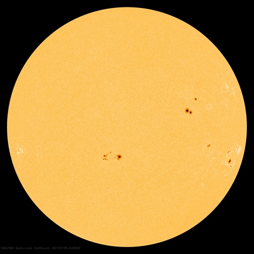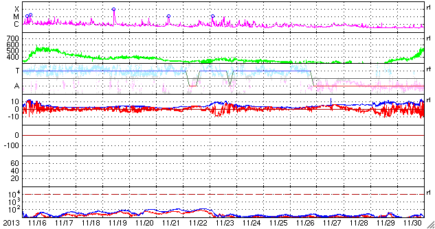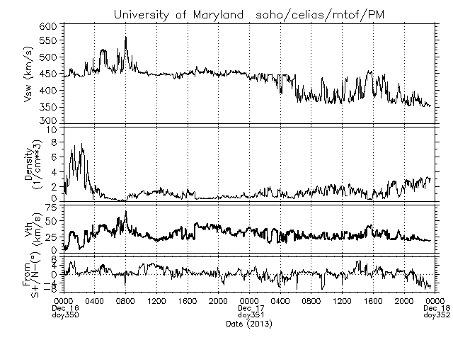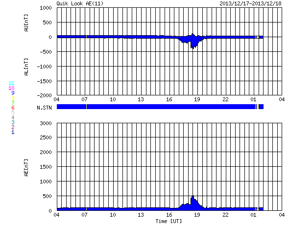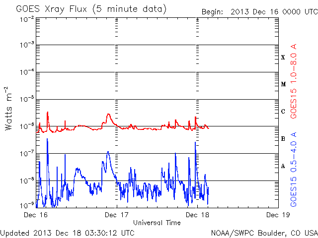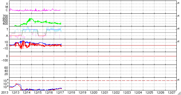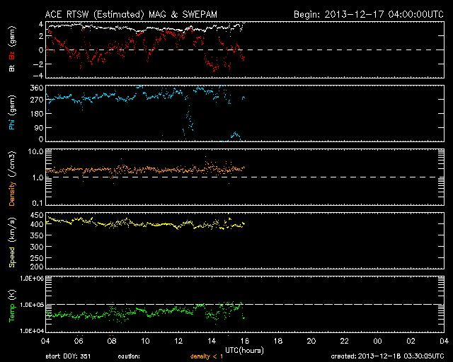 2013/12/18 12:30 更新 太陽風は穏やかで、磁気圏も静穏です。太陽も概ね穏やかです。 担当 篠原 ACE衛星の太陽風データでは、 18日1時(世界時17日16時)まで400km/秒の状態が続いています。 以降のデータが欠測になっているので、 参考にSOHO衛星プロトンモニターによる 2日間の太陽風の図を掲載します。 ACE衛星とは多少の違いはありますが、 現在は350km/秒と、もう一段低速になっている様です。 磁気圏も、基本的に静穏です。 AE指数は、500nTの変化が真ん中で1回だけ起きていますが、 その他は変化していません。 27日周期の図の前周期の変化に見られるように、 今後も低速の穏やかな太陽風が続きそうです。 太陽は、C1〜2の小さいフレアが4回ほど発生しています。 発生地点は、GOES衛星のX線写真が見られず、分かりません。 (X線のグラフも、先ほどまで途中から欠けていました) 太陽の南東の端(左下)に活動的な領域があるようです。 今後、どのような領域が姿を現すでしょうか。