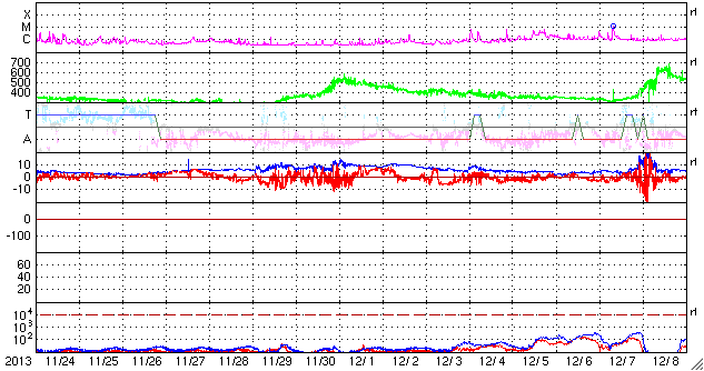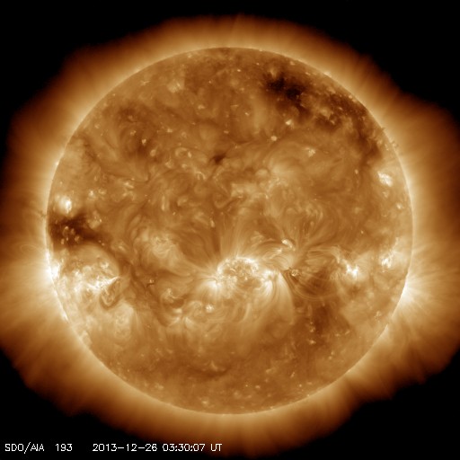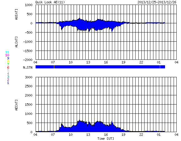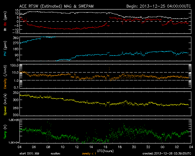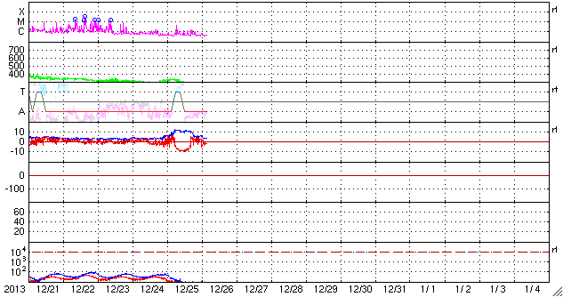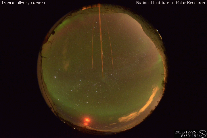 2013/12/26 12:39 更新 太陽風磁場の南向きが長時間続き、磁気圏の活動度を高めました。 担当 篠原 昨日のニュースの後、 太陽風の磁場強度は更に高まり、 25日14時(世界時25日5時)に、13nTに達しました。 そのまま、半日後の26日2時(世界時25日17時)頃まで、 10nTを超えた状態が続きました。 磁場の強まりとともに南北成分が南向きに大きく振れ、 半日にわたって、-5nTから-10nTの間をゆっくりと変化しました。 太陽風速度は、330〜280km/秒とかなり遅かったのですが、 磁場の強い南向きの影響で、磁気圏の活動度も高まっています。 AE指数のグラフでは、 500nTと規模は特に大きくはありませんが、 半日ほど、高まった状態が続いています。 この時間帯に、カナダやアラスカのライブカメラでは、 オーロラの活動を見ることができました。 ノルウェーは時間帯と天候の関係で、条件が悪かったのですが、 AE指数の変化が終わりつつある、 世界時25日19時頃の全天カメラの様子を紹介します。 静かな活動ですが、現地のクリスマスの夜のオーロラです。 現在の太陽風は、磁場強度は3nTとむしろ弱まり、 速度も270km/秒とかなり遅くなっています。 このまま穏やかな風がしばらく続きそうです。 太陽は、西に沈んでいった1928黒点群で C4.7やC1のフレアが4回発生し、 中央部の1931、東側の1936群などでも、 C1のフレアが4回発生しています。 変化は頻繁に起きているのですが、 規模は小さくなっています。 ![]() ノルウェー・トロムソの全天カメラにより撮影された、12月25日のオーロラの活動。 (c) 国立極地研究所、(動画加工 : 宇宙天気ニュース) ![]() SDO衛星のAIA193カメラによる太陽コロナの様子 (c) SDO (NASA) ![]() SDO衛星による太陽の可視光写真。マウスの矢印を写真に重ねると、黒点番号付きの写真に切り替わります。 (c) SDO (NASA) ![]() ACEが観測した太陽風の磁場(1番上の枠、白線は全体の強度、赤線は南北成分) および、太陽風の密度(3番目の橙線)、速度(4番目の黄線) (c) NOAA/SWPC ![]() リアルタイムAE指数 下段のAEグラフの値が高くなると、オーロラ活動が活発化しています。 (c) 京都大学, NICT ![]() 27日の太陽周期に合わせたデータプロット 太陽が同じ面を地球に向けていた27日前の変化から、今後を予想することができます。 (c) 作図:宇宙天気ニュース