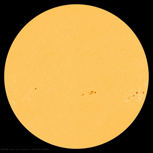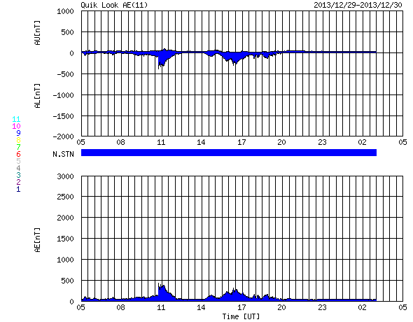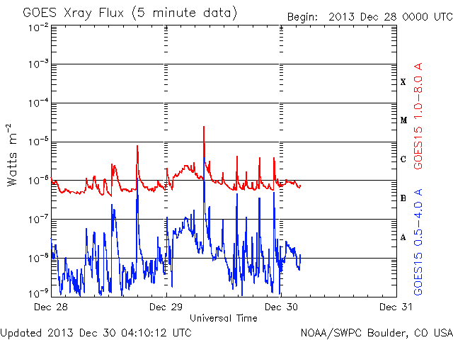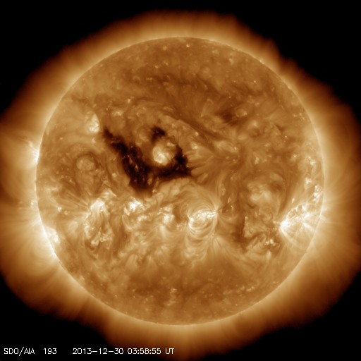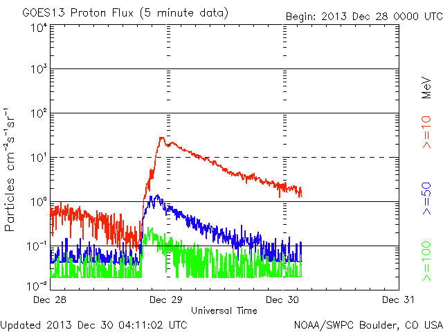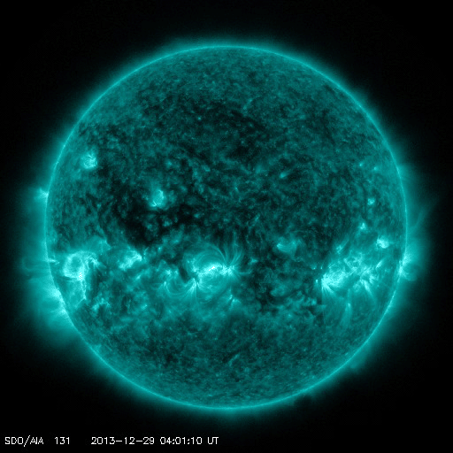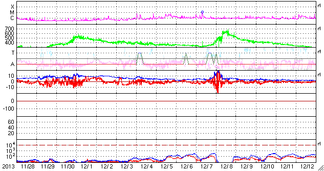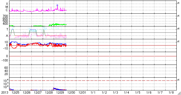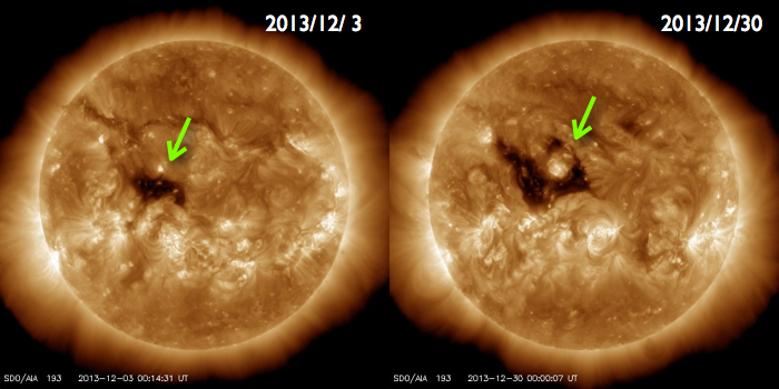 2013/12/30 13:11 更新 M3の中規模フレアが発生しました。1936黒点群の活動は続いています。 担当 篠原 太陽の中心部の1936黒点群の活動が続いています。 昨夕、29日17時(世界時29日8時)にM3.1の中規模フレアを起こし、 その前後には、C3.1、C3.8、C5.1、C5.4、C4.6などの 大きめのCクラスフレアも起こしています。 活動の様子をSDO衛星AIA131の動画で紹介します。 最も明るく光っているのがM3フレアですが、 その他にもたくさんの輝きが発生しています。 この領域の活動にはこの後も注目して下さい。 太陽風は、350km/秒へ速度が下がり、 より低速の風になっています。 磁場強度は5nTと平均的な値で安定しています。 磁場の南北成分は、振れ幅は小さいですが、 南寄りになったり、北寄りになったり、 ゆっくりと変化しています。 このため、AE指数も300〜400nTの 小規模の変化が発生しています。 きれいなオーロラが見えていた地域もありそうです。 SDO衛星AIA193の太陽コロナ写真では、 赤道域のコロナホールが、太陽の中心線に達しています。 3日後の1月2日頃から太陽風に影響が見られるかもしれません。 このコロナホールは、27日前(12月3日)と比べると、 面積がかなり大きくなっています。 このため、太陽風への影響も前周期より大きいものになりそうです。 2014年最初のオーロラの強まりを作ることになりそうです。 太陽放射線の強まりは、その後は低下が続いています。 既に警戒レベルを割っています。 ![]() SDO衛星AIA131による、1936黒点群のフレア活動の様子。 (c) SDO (NASA)、 (動画加工 : 宇宙天気ニュース) ![]() SDO衛星AIA193による、太陽のコロナホールの27日間の変化。 (c) SDO (NASA)、作図:宇宙天気ニュース ![]() SDO衛星のAIA193カメラによる太陽コロナの様子 (c) SDO (NASA) ![]() SDO衛星による太陽の可視光写真。マウスの矢印を写真に重ねると、黒点番号付きの写真に切り替わります。 (c) SDO (NASA) ![]() GOES衛星の太陽X線データ (c) NOAA/SWPC ![]() ACEが観測した太陽風の磁場(1番上の枠、白線は全体の強度、赤線は南北成分) および、太陽風の密度(3番目の橙線)、速度(4番目の黄線) (c) NOAA/SWPC ![]() リアルタイムAE指数 下段のAEグラフの値が高くなると、オーロラ活動が活発化しています。 (c) 京都大学, NICT ![]() 27日の太陽周期に合わせたデータプロット 太陽が同じ面を地球に向けていた27日前の変化から、今後を予想することができます。 (c) 作図:宇宙天気ニュース