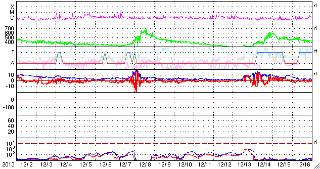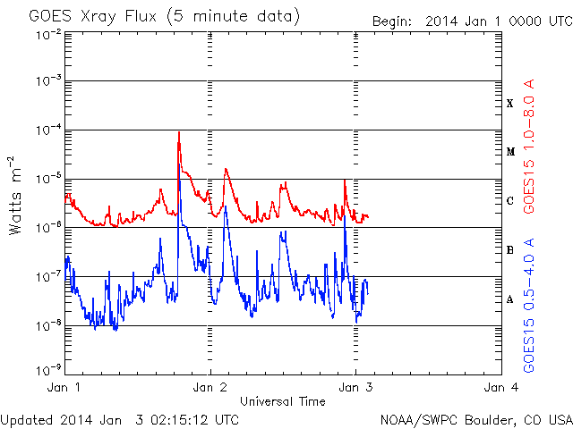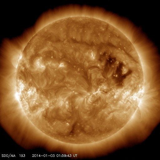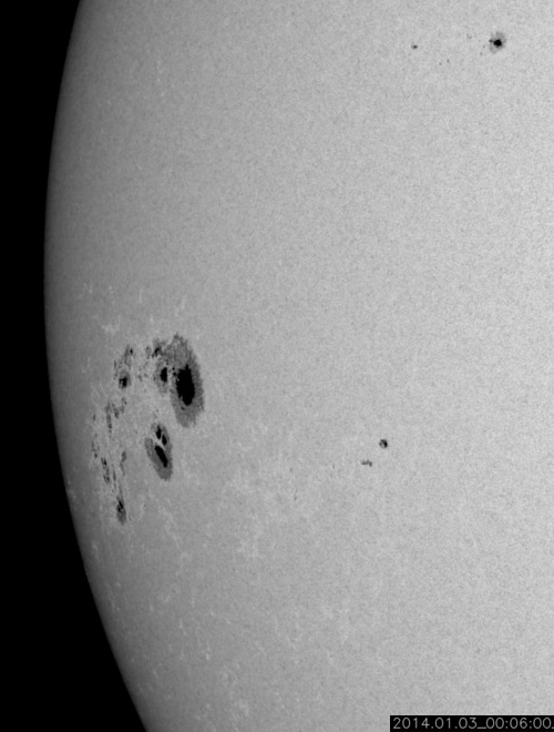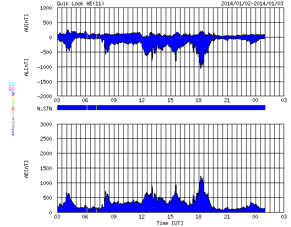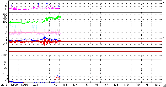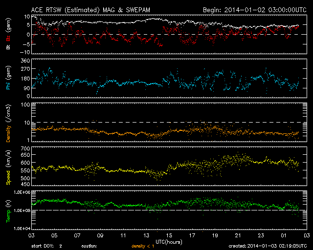 2014/ 1/ 3 11:19 更新 太陽風は600km/秒の高速風です。フレア活動も続いています。ムルマンスクのオーロラをどうぞ。 担当 篠原 ロシア・ムルマンスクの福島さんより、 新年のオーロラ写真が届きました。 最初の2枚は、1月1日にムルマンスク市の緑の岬で、 チモフェーエフ・マルク氏によって撮影されたオーロラです。 岬の上に立つ高さ50mのアリョーシャ像 (第二次世界大戦の兵士を記念する像の様です)や、 新年を祝う花火との共演です。 「アリョーシャは欧州からの敵の侵入を睨む様に建っていますが、 この日はまるで一服しながらオーロラ観望しているかの様に見えます。」 と、福島さんのコメントです。 まさに、視線の先に緑のオーロラが輝いています。 オーロラと花火の組み合わせというのは、珍しく、見事な写真ですね。 3枚目は、1月2日にアパチット市の クキスブンチョル山(ヒビノ山脈の一部)上空のオーロラを、 ジガーノフ・ヴァレンチン氏が撮影した写真です。 「まるで薄雲に負けまいと、 濃いオーロラが幅広くそして強く光っています。(福島さん)」 真っ白に輝く山や木々の冬景色も印象的です。 2014年が始まったばかりのオーロラの写真を どうもありがとうござます。 太陽風は、高速の状態が続いています。 日付が今日に変わった頃から、 速度は600km/秒台に上昇しました。 一方、磁場強度はゆっくりと下がって、 現在は5nTと平均的な値に戻っています。 高速風は最も速度が高い領域にかかっている様です。 磁場の南北成分は、南北に頻繁に振れています。 このため、オーロラの活動度も高まり、 AE指数のグラフでは、600〜1000nTの活発な変化が 繰り返し発生しています。 極域ではにぎやかにオーロラが発生している様です。 SDO衛星AIA193では、 コロナホールは太陽の西側にだいぶ移動しています。 そろそろ高速風は後半に入りそうです。 磁場強度がもう一段下がり、 速度も次第に低下に向かうと思われます。 太陽風の強まりを受けて、 放射線帯の高エネルギー電子が増加しています。 GOES衛星の観測では数千のレベルに上がっています。 この後、更に高まる可能性があります。 太陽では、東端の1944黒点群のフレア活動が続いています。 昨日のニュースの直後にM1.7、今朝にM1.2と2つの中規模フレアと、 C9.5、C5.3、C4.9など大きいCクラスのフレアも起こしています。 SDO衛星による1944黒点群の拡大写真を掲載します。 規模の大きい黒点群で、 引き続きフレアの発生に注目して下さい。