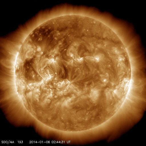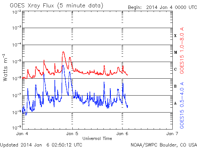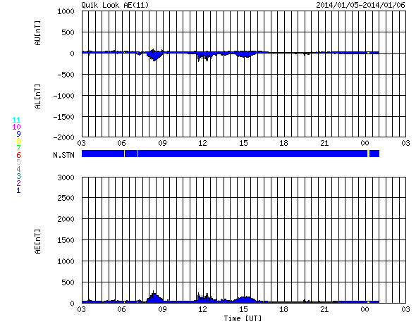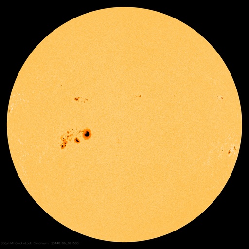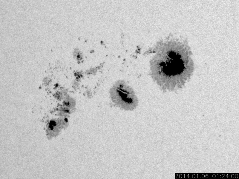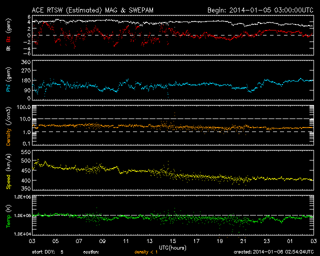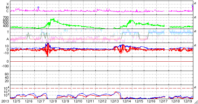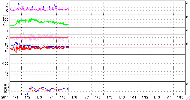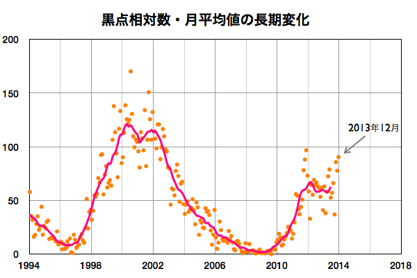 2014/ 1/ 6 11:54 更新 12月の黒点数は90.3でした。太陽風は平均的な速度に下がりました。 担当 篠原 12月の太陽黒点相対数が、SIDCより発表されました。 月平均値は 90.3 と、現在の第24活動周期としては 2011年11月の96.7に続く、第2位の高い値でした。 図に示している長期変化の赤線も、 今月は最後の部分で上昇を示しています。 第23期にも見られた2番目のピークに入っている様です。 今後、この高まりがいつまで続くかですが、 グラフの推移を見ると、そう長くはなさそうに思います。 現在の黒点活動の高まりをしっかり見届けて下さい。 現在の注目の1944黒点群は、巨大な姿を保っています。 今日も日食メガネで見つけることができました。 昨日よりも太陽の中心に近づいています。 もし天気が良ければ、ぜひ挑戦してみて下さい。 今日の鹿児島は薄雲がかかり始めています。 晴天のチャンスはそう長くないかもしれません。 一方、1944群のフレアの発生はやや落ち着いています。 昨日のニュース以降は、C6.6、C3.4、C7.1と、 数値は比較的大きいですが、 Cクラスのフレアが3回程度起きただけです。 しかし、しばらく休んで、 再び活動を強めることもよくあるので、 引き続き1944群には注目して下さい。 太陽では、北半球側の東西にそれぞれ新しい黒点が現れています。 黒点の出現はにぎやかです。 太陽風は、速度の低下が続き、 現在は400km/秒と平均的な値に下がったところです。 磁場強度も3nTへ下がり、やや弱い値に変わっています。 磁気圏の活動は、昨日より小さくなっていて、 AE指数のグラフは、200nT程度の小さい変化が数回起きています。 高速の太陽風は終わり、しばらく穏やかになりそうです。