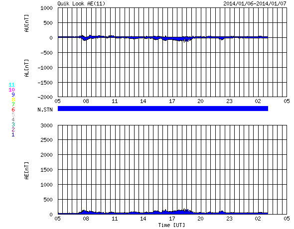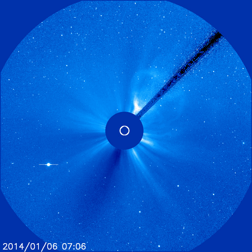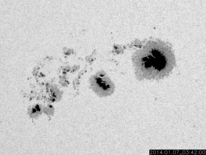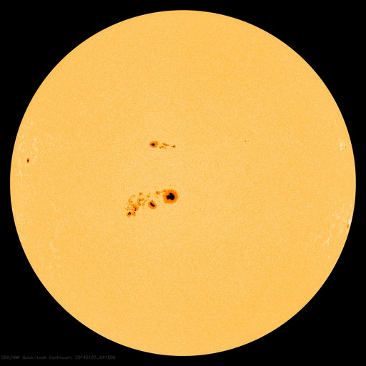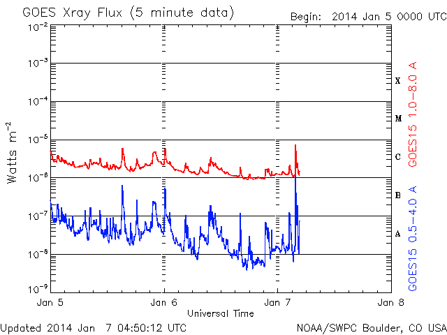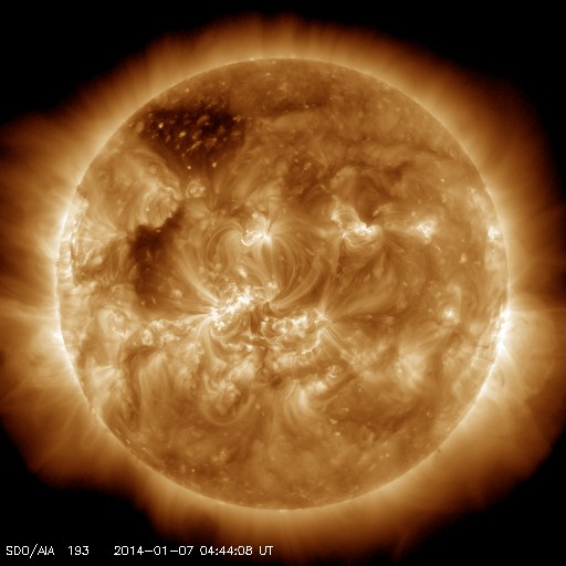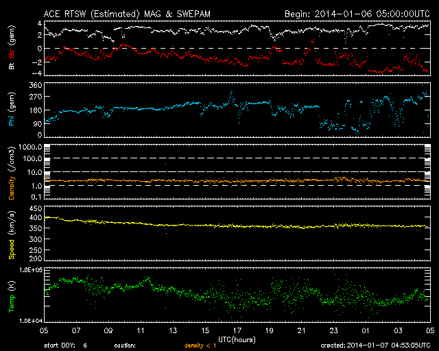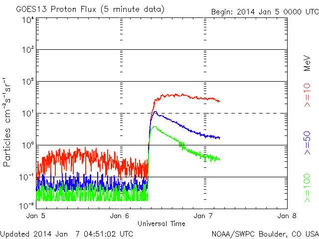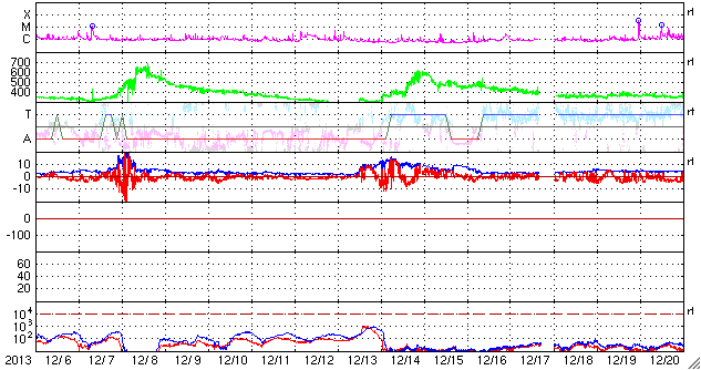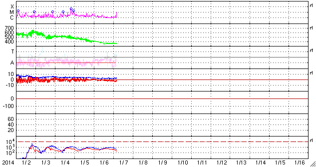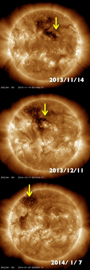 2014/ 1/ 7 13:53 更新 1944黒点群は今日も肉眼黒点の大きさです。太陽風は低速になりました。 担当 篠原 1944黒点群は、今日も大きな姿を現しています。 日食メガネで太陽を見ると、 ちょうど真ん中に黒い点が見えています。 この黒点群のフレアの活動は弱まっていて、 C2.6、C2.0、C2.6と小さいCクラスのフレアを 3回起こした程度です。 一方、西に没した領域で大規模なフレアの発生があった様です。 SOHO衛星LASCO C3で、昨夕、6日17時(世界時6日8時)に、 CMEの噴出が発生しています。 この時刻のSDO衛星AIA193を見ると、 右端のコロナが噴き出す瞬間が写っています。 太陽の向こう側でフレアが発生したのでしょう。 CMEと同時に、太陽放射線(非常に高速の陽子)も増加して、 GOES衛星の観測では、10の警戒レベルを超えて、 40まで増加しています。 SOHO衛星LASCO C3の動画でも、CMEの噴き出しとともに、 太陽放射線による白いちらつきが急に増加しています。 また、太陽では7日13時(世界時7日4時)に、 北半球側の1946黒点群で M1.0の中規模フレアも発生しています。 太陽風は、速度が400km/秒から350km/秒へ下がり、 低速の風に変わっています。 磁場強度も、3nTとやや弱い値で安定しています。 太陽風の磁場は、弱い南向きに振れています。 このため、磁気圏でも小さい活動が続いているようで、 AE指数では、小さい変化がずっと観測されています。 SDO衛星AIA193では、 太陽の東側にコロナホールが見えています。 この位置は、過去の27日前、54日前の太陽と比較すると、 少しずつ左に動いています(4枚目の写真)。 27日周期の図を見ると、 前周期の12月14日に高速の太陽風が到来していますが、 今回の回帰は2日ほど遅れそうです。 しかも、コロナホールは小さくなっている様子で、 影響は弱まるかもしれません。