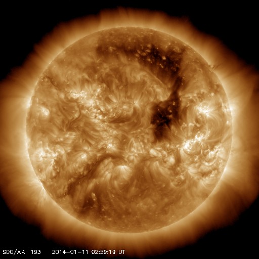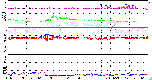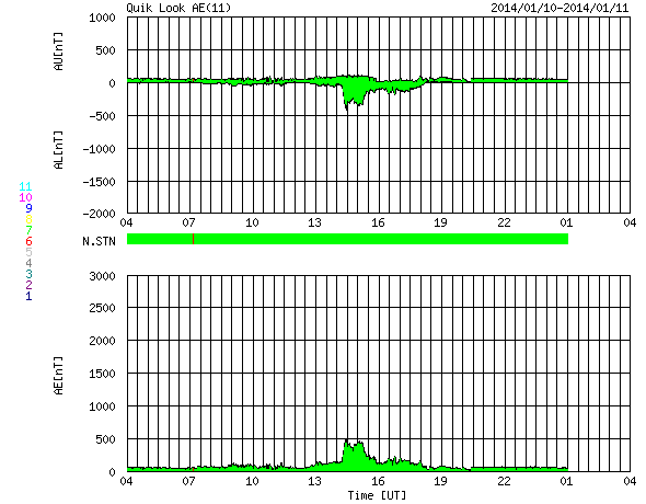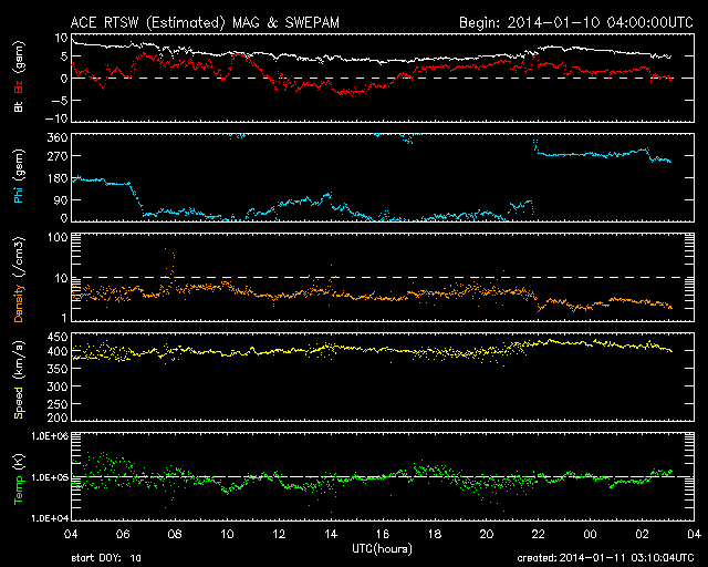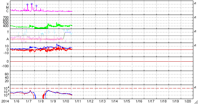 2014/ 1/11 12:10 更新 太陽風は平均的な状態が続いています。コロナホールの影響が始まりそうです。 担当 篠原 太陽風の速度は、400km/秒で安定しています。 磁場強度も5nTに下がり、 太陽風は速度、磁場強度ともに平均的な状態です。 CMEによる太陽風の変動については、その後も特に見られず、 昨日の小さな変化が対応する現象だったのかもしれません。 しかし、2日と比較的短時間で地球へ到来したにしては、 太陽風の変化は小さく、よく分からないところです。 磁気圏は概ね静穏です。 AE指数は、400nTくらいの小さい変化がひとつ起きた程度です。 SDO衛星AIA193の太陽コロナ写真では、 コロナホールが西側にだいぶ進んでいます。 そろそろこの領域の影響で、 高速の太陽風が始まりそうです。 27日周期の図の上段、12月14〜16日の高速風の回帰です。 コロナホールの位置の関係で、今回の到来は少し遅れそうです。 太陽のフレア活動は、静かになっています。 1950、1944、1946黒点群で、 C1の小さいフレアがそれぞれ1回起きただけです。 太陽放射線も低下が続いています。 もうすぐ警戒レベルの10を割りそうです。