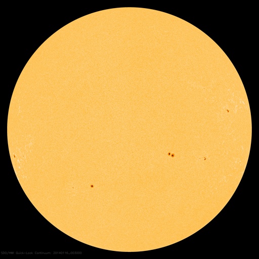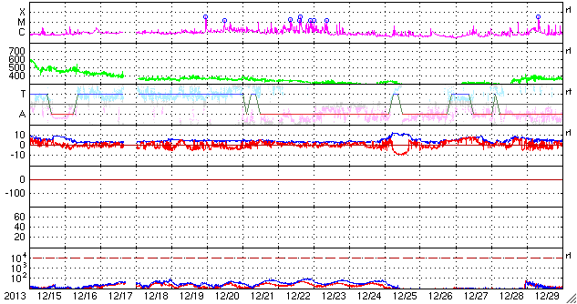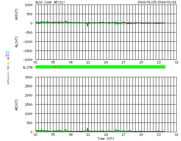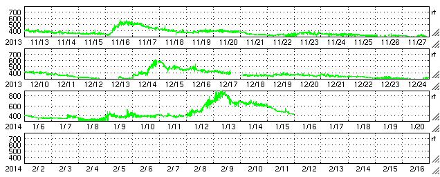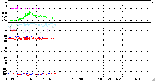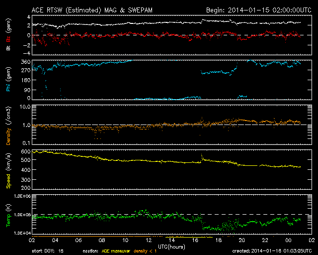 2014/ 1/16 10:03 更新 高速風は終わり、太陽風は平均的な速度に戻りました。太陽も穏やかです。 担当 篠原 太陽風の速度は低下が続き、 現在は430km/秒と平均的な状態に戻りました。 太陽風の磁場強度は、2nTに弱まったままで安定しています。 今回の高速太陽風は、4日近く続きました。 27日周期で過去2周期の変化と比較すると(1枚目の図)、 高速風の到来は2日程度ずつ次第に遅れていました。 これは、1月7日のニュースで掲載したように、 北半球に広がるコロナホールの場所が、 次第に左側にずれていったことと関係しています。 また、速度の高まりも、 2周期前は550km/秒、1周期前は600km/秒、 そして、今回は850km/秒と次第に変化しています。 27日後の次の周期は、2月10日前後になりそうです。 その時のコロナホールの分布や、高速太陽風の変化などは、 今回ともまた異なっている可能性があります。 到来を楽しみに待ちましょう。 現在の磁気圏の活動は穏やかです。 AE指数のグラフには、目立った変化はありません。 高速太陽風が通り過ぎて、 これからしばらく穏やかになりそうです。 太陽では、特にフレアの発生はなく、 GOES衛星のX線のグラフは静かになっています。 太陽の東端から新しい黒点が顔を出しています。 どの程度の活動度を持った黒点群でしょうか。