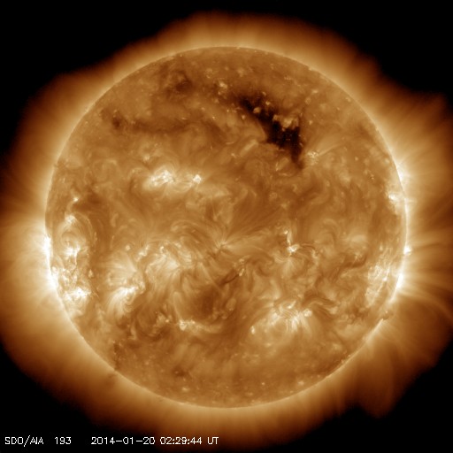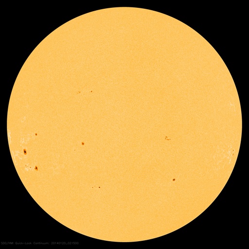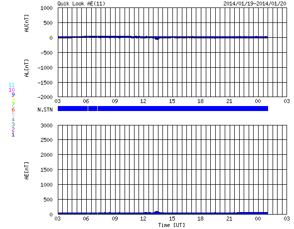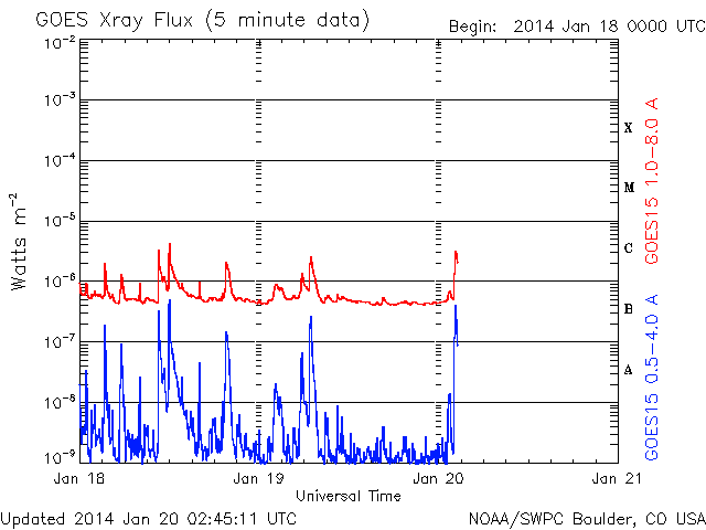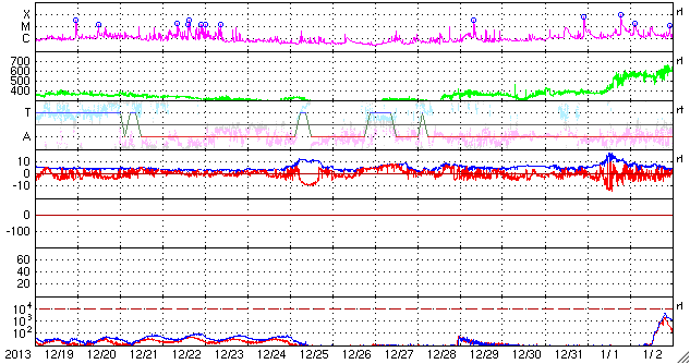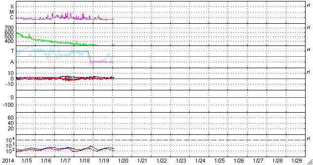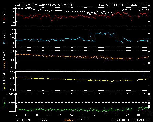 2014/ 1/20 11:49 更新 フレアの発生は少なくなっています。太陽風の速度は280km/秒まで下がりました。 担当 篠原 太陽のフレアの発生は少なくなっています。 南東部の1959黒点群は、 昨日の午後、19日16時(世界時19日7時)にC2.7と、 つい先ほど、20日11時(世界時20日2時)にC3.4を起こした程度で、 やや落ち着いています。 一方、太陽面は、南半球側に2つ新しい黒点群が出現して、 黒点群の数としてはだいぶにぎわっています。 東端の1960群の向こう側からも、 また新しい黒点が現れそうで、これらの活動にも注目して下さい。 太陽風は、昨日のニュース以降さらに速度が低下して、 今日未明には280km/秒まで下がりました。 現在は少し戻して300km/秒ですが、 太陽風のとても遅い状態は続いています。 磁場強度も、2〜3nTと弱い状態です。 太陽風はとても穏やかです。 磁気圏の活動も静かで、AE指数は全く変化していません。 SDO衛星AIA193では、北半球側のコロナホールが 太陽の自転によって西側へ動いています。 明日か明後日くらいに、 この領域からの影響が及ぶかもしれません。 それがなければ、低速の穏やかな太陽風がしばらく続くでしょう。 ![]() SDO衛星のAIA193カメラによる太陽コロナの様子 (c) SDO (NASA) ![]() SDO衛星による太陽の可視光写真。マウスの矢印を写真に重ねると、黒点番号付きの写真に切り替わります。 (c) SDO (NASA) ![]() GOES衛星の太陽X線データ (c) NOAA/SWPC ![]() ACEが観測した太陽風の磁場(1番上の枠、白線は全体の強度、赤線は南北成分) および、太陽風の密度(3番目の橙線)、速度(4番目の黄線) (c) NOAA/SWPC ![]() リアルタイムAE指数 下段のAEグラフの値が高くなると、オーロラ活動が活発化しています。 (c) 京都大学, NICT ![]() 27日の太陽周期に合わせたデータプロット 太陽が同じ面を地球に向けていた27日前の変化から、今後を予想することができます。 (c) 作図:宇宙天気ニュース