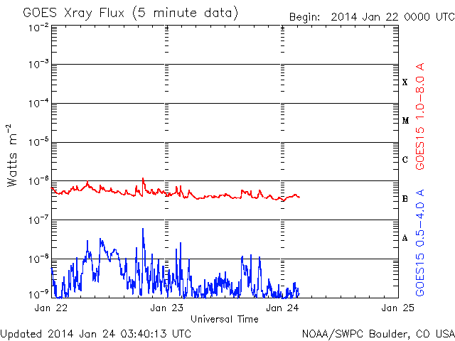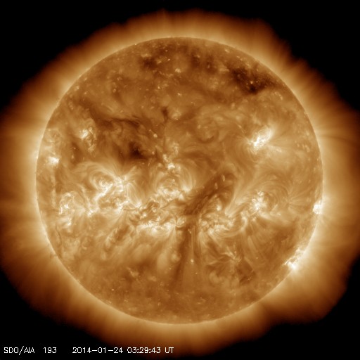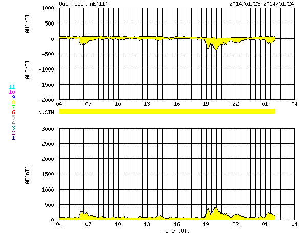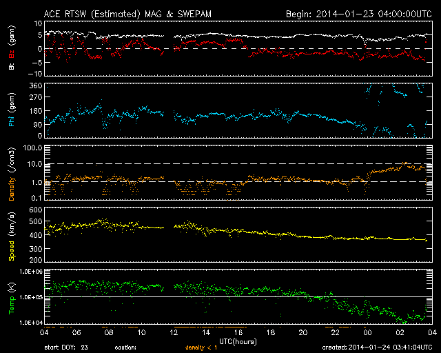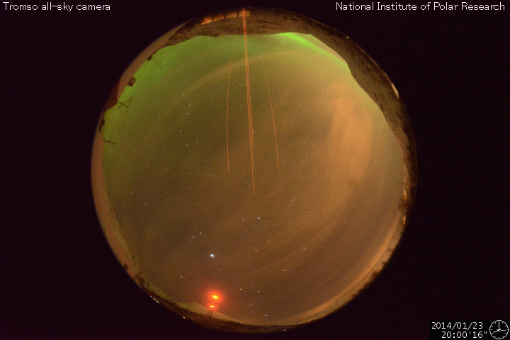 2014/ 1/24 12:41 更新 太陽風はやや低速の風になっています。太陽も穏やかです。 担当 篠原 太陽風の速度は、今日未明に400km/秒台を割り、 現在は370km/秒とやや低速の風になっています。 磁場強度も、5nTと平均的な値に下がっています。 磁場の南北成分は、 ACEの図の初めと後半部で、弱い南向きになっています。 この影響で、AE指数のグラフは、 初めに300nTの小さい山と、後半に400nTの山が発生しています。 この後半の高まりに対応するオーロラの様子を、 ノルウェー・トロムソの全天カメラの動画で紹介します。 トロムソで好天が続いていることもあり、 このところ毎日のようにオーロラの動画を見ることができます。 太陽風は、高速風が終わり、 しばらく穏やかな状態が続きそうです。 太陽は、特にフレアの発生はなく穏やかです。 黒点群の数は多いですが、 黒点は次第に小さいものばかりになっています。 ![]() ノルウェー・トロムソの全天カメラにより撮影されたオーロラの活動。 (c) 国立極地研究所、(動画加工 : 宇宙天気ニュース) ![]() SDO衛星のAIA193カメラによる太陽コロナの様子 (c) SDO (NASA) ![]() SDO衛星による太陽の可視光写真。マウスの矢印を写真に重ねると、黒点番号付きの写真に切り替わります。 (c) SDO (NASA) ![]() ACEが観測した太陽風の磁場(1番上の枠、白線は全体の強度、赤線は南北成分) および、太陽風の密度(3番目の橙線)、速度(4番目の黄線) (c) NOAA/SWPC ![]() リアルタイムAE指数 下段のAEグラフの値が高くなると、オーロラ活動が活発化しています。 (c) 京都大学, NICT ![]() GOES衛星の太陽X線データ (c) NOAA/SWPC ![]() | |||||||||||||||||||||||||||||||||||||||||||||||||||||||||||||||||||||||||||||||||||||||||||||||||||||||||||||||||||||||||||||||||||||||||||||||||||||||||||||||||||||||||||||||||||||||||||||||||||||||||||||||||||||||||||||