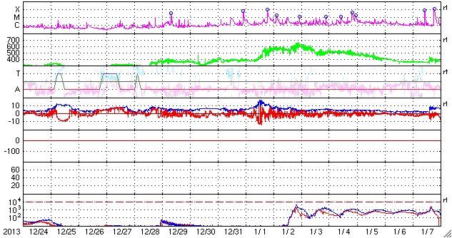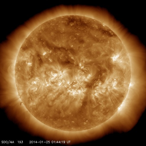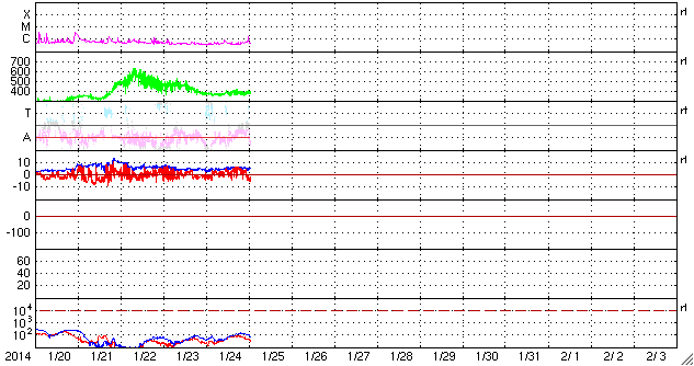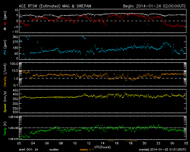 2014/ 1/25 10:51 更新 太陽風はやや低速で穏やかです。磁場が南に振れていてオーロラ活動が見られるかもしれません。 担当 篠原 太陽風は、速度が380km/秒前後と やや低速の状態で安定しています。 磁場強度も5nTと平均的な状態です。 磁場の南北成分は、 昨日のニュースの後から北向きの傾向に変わり、 磁気圏の活動も静かになっています。 AE指数のグラフは小さい変化が部分的に見られる程度です。 一方、今朝くらいから太陽風の磁場は、 南向きに切り替わっていて、-5nTに振れています。 この影響で、これから小・中規模のオーロラ活動が 見られるようになるかもしれません。 この状態が続けば、ライブカメラなどは楽しみです。 太陽風は、穏やかな状態がしばらく続きそうです。 SDO衛星AIA193の太陽コロナ写真では、 コロナホールは特に見られません。 太陽の活動も穏やかです。 今朝、25日9時(世界時25日0時)に、 C1の小さいフレアが1959黒点群で発生した程度です。 ![]() SDO衛星のAIA193カメラによる太陽コロナの様子 (c) SDO (NASA) ![]() SDO衛星による太陽の可視光写真。マウスの矢印を写真に重ねると、黒点番号付きの写真に切り替わります。 (c) SDO (NASA) ![]() ACEが観測した太陽風の磁場(1番上の枠、白線は全体の強度、赤線は南北成分) および、太陽風の密度(3番目の橙線)、速度(4番目の黄線) (c) NOAA/SWPC ![]() リアルタイムAE指数 下段のAEグラフの値が高くなると、オーロラ活動が活発化しています。 (c) 京都大学, NICT ![]() 27日の太陽周期に合わせたデータプロット 太陽が同じ面を地球に向けていた27日前の変化から、今後を予想することができます。 (c) 作図:宇宙天気ニュース