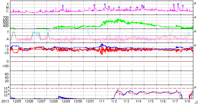 磁場の南北成分は、南寄りに振れる傾向が続いているようです。
