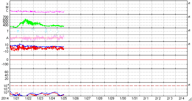 2014/ 1/25 10:51 太陽風はやや低速で穏やかです。磁場が南に振れていてオーロラ活動が見られるかもしれません。