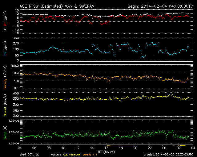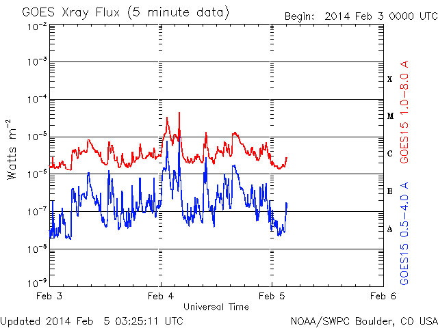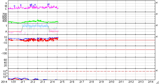 - 2014/ 2/ 3 12:02 太陽風の小規模の変動が到来しました。太陽は中規模フレアが連続的に発生しています。