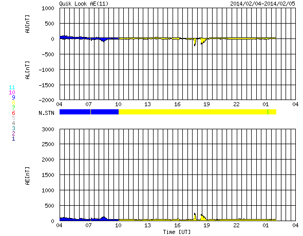 下段のAEグラフの値が高くなると、オーロラ活動が活発化しています。