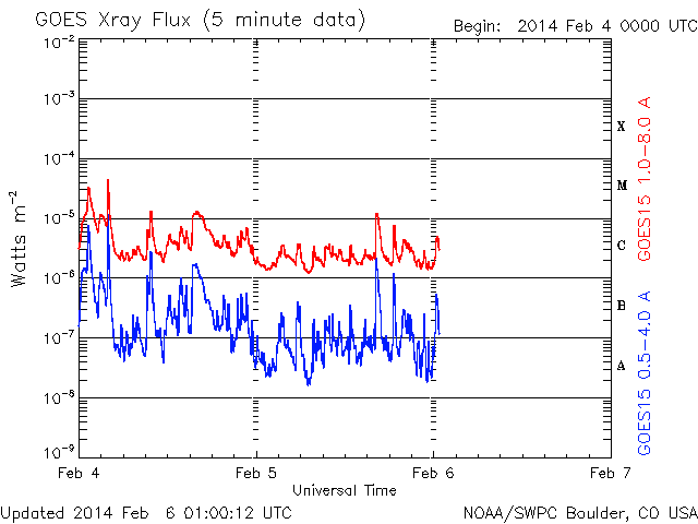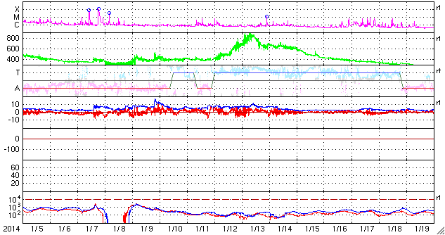 - 2014/ 2/ 3 12:02 太陽風の小規模の変動が到来しました。太陽は中規模フレアが連続的に発生しています。