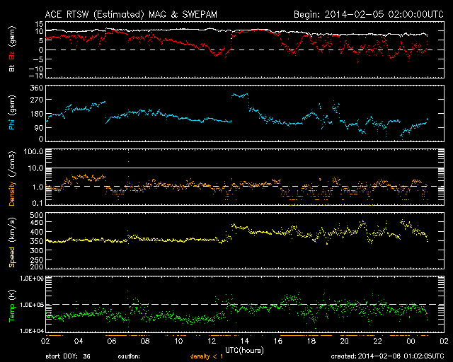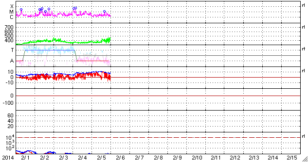 - 2014/ 2/ 5 12:27 1967黒点群の活動は続いています。太陽風は低速で、磁気圏も穏やかです。