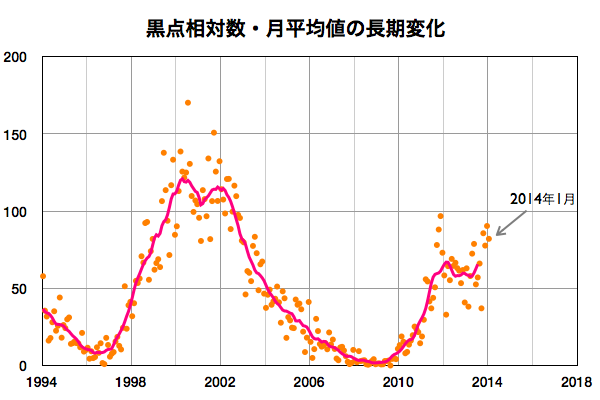 1月の黒点数は82.0でした。太陽ではフレアが続いていますが、勢いは弱まりつつあります。