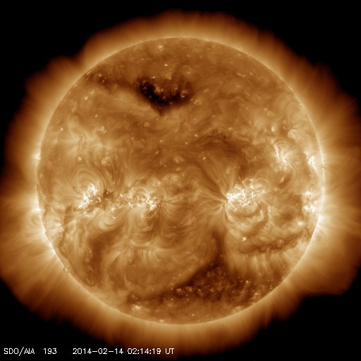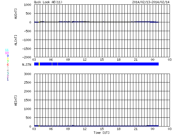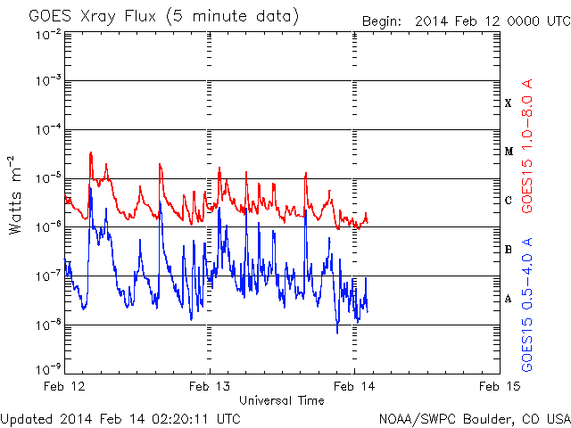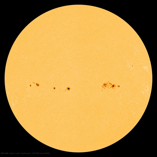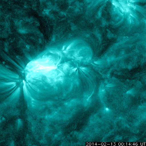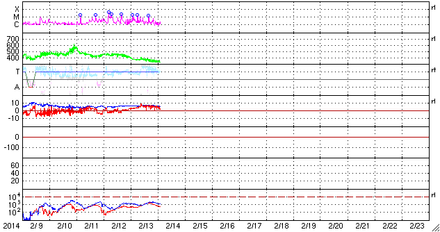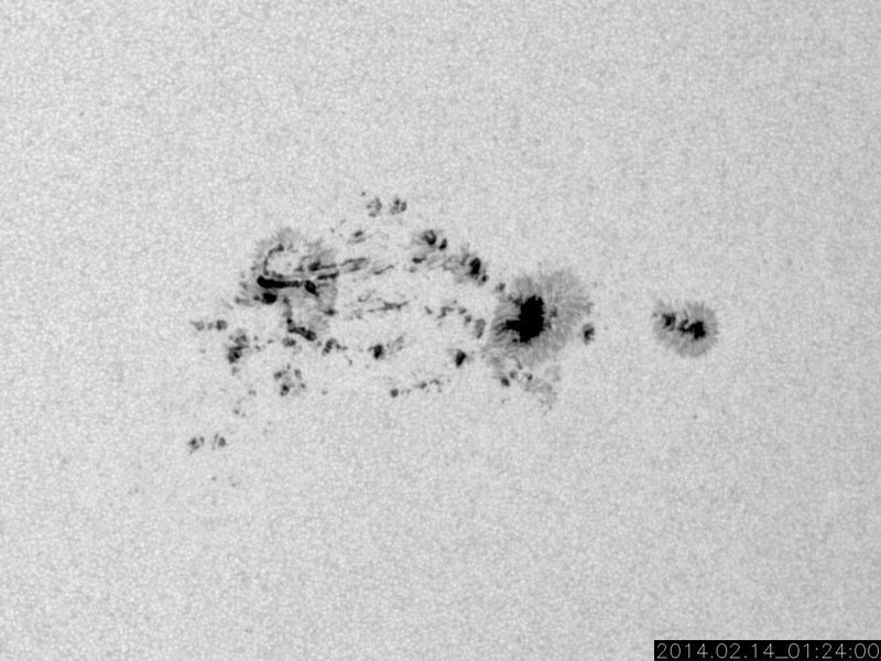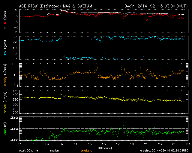 2014/ 2/14 11:24 更新 1974黒点群でフレアが続いています。CMEによる太陽風の乱れが近づいています。 担当 篠原 1974黒点群の姿が変化しています。 SDO衛星による拡大写真を掲載します。 小さい黒点が飛び散ったように多数分布して、複雑な姿です。 1974群ではフレアの活動も続いていて、 昨日のニュース以降も、 M1.7、M1.0、M1.4と3回の中規模フレアや、 C8.4、C6.6などのCクラスフレアを起こしています。 引き続きフレアの発生に注目して下さい。 太陽風は、370km/秒から340km/秒へ速度が下がり、 より低速の風に変わっています。 磁場強度は6nTと平均的な状態です。 磁場の南北成分は、北向きが続いています。 このため磁気圏は静穏になっていて、 AE指数のグラフは全く変化していません。 昨日のニュースでお知らせした様に、 CMEによる太陽風の乱れが地球に近づいています。 今夜から明日にかけて到来する可能性があります。 速度の変化は、普通の高速風程度ではないか思いますが、 磁場が強まって、大きく南向きに振れると、 磁気圏活動が活発に発生します。 今後の太陽風データや、オーロラのライブカメラに注目して下さい。 ![]() 1974黒点群の拡大写真。SDO衛星。 (c) SDO (NASA) ![]() 1974黒点群の活発なフレア活動の様子。SDO衛星AIA131。 (c) SDO (NASA)、 (動画加工 : 宇宙天気ニュース) ![]() SDO衛星のAIA193カメラによる太陽コロナの様子 (c) SDO (NASA) ![]() SDO衛星による太陽の可視光写真。マウスの矢印を写真に重ねると、黒点番号付きの写真に切り替わります。 (c) SDO (NASA) ![]() GOES衛星の太陽X線データ (c) NOAA/SWPC ![]() ACEが観測した太陽風の磁場(1番上の枠、白線は全体の強度、赤線は南北成分) および、太陽風の密度(3番目の橙線)、速度(4番目の黄線) (c) NOAA/SWPC ![]() リアルタイムAE指数 下段のAEグラフの値が高くなると、オーロラ活動が活発化しています。 (c) 京都大学, NICT ![]() 27日の太陽周期に合わせたデータプロット 太陽が同じ面を地球に向けていた27日前の変化から、今後を予想することができます。 (c) 作図:宇宙天気ニュース