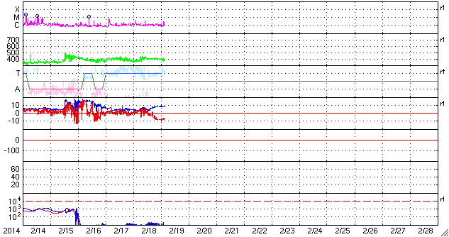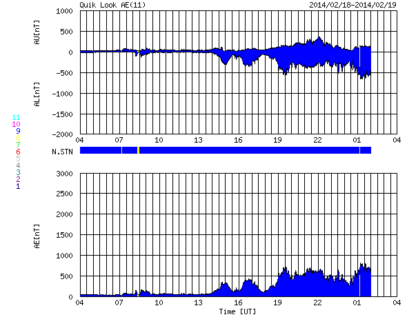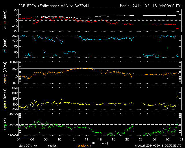 2014/ 2/19 12:36 更新 太陽風の乱れが到来して、磁場が南向きに振れています。オーロラの活動が高まりそうです。 担当 篠原 太陽風の乱れが到来して、磁場が南向きに強まっています。 その影響で、磁気圏の活動も高まっています。 19日0時(世界時18日15時)頃から、 太陽風の磁場強度がやや強まって、8nTに高まりました。 それと共に、磁場の南北成分が南向きに振れる様になり、 19日2時(世界時18日17時)頃に-5nTを越え、 その後-8nTまで強まりました。 太陽風の速度は、400kkm/秒付近で安定しています。 この状態は、半日ほど経過した現在も続いています。 太陽から磁場のかたまりが流れてきた様です。 この影響で、オーロラの活動度を表すAE指数も変化が高まり。 600〜700nTの中規模の変化が数時間にわたって続いています。 そして、ちょうど今、 19日12時(世界時19日3時)に、次の太陽風の乱れが到来した様です。 速度が480km/秒とやや高速の状態に高まり、 磁場強度は15nTに強まっています。 磁場の南北成分も南向きに強まっていて、-15nTに振れています。 従って、これから磁気圏の活動度は更に高まりそうです。 太陽風の変化がどの程度継続するかによりますが、 激しいオーロラの活動が見られる可能性があります。 太陽風のデータや、ライブカメラに注目して下さい。 太陽は、東端の1982黒点群で、 C1〜3の小規模フレアが数回発生しています。 近くでは、新しい黒点群が現れています。 また、東の端の向こう側にも別の活動的な領域があるようで、 東端周辺の活動に注目して下さい。 ![]() SDO衛星のAIA193カメラによる太陽コロナの様子 (c) SDO (NASA) ![]() SDO衛星による太陽の可視光写真。マウスの矢印を写真に重ねると、黒点番号付きの写真に切り替わります。 (c) SDO (NASA) ![]() ACEが観測した太陽風の磁場(1番上の枠、白線は全体の強度、赤線は南北成分) および、太陽風の密度(3番目の橙線)、速度(4番目の黄線) (c) NOAA/SWPC ![]() リアルタイムAE指数 下段のAEグラフの値が高くなると、オーロラ活動が活発化しています。 (c) 京都大学, NICT ![]() 27日の太陽周期に合わせたデータプロット 太陽が同じ面を地球に向けていた27日前の変化から、今後を予想することができます。 (c) 作図:宇宙天気ニュース