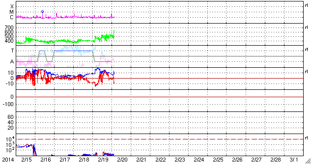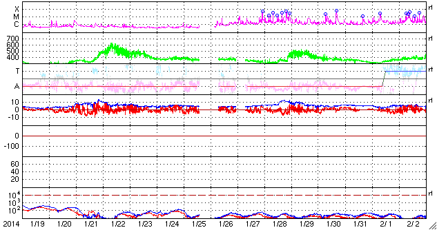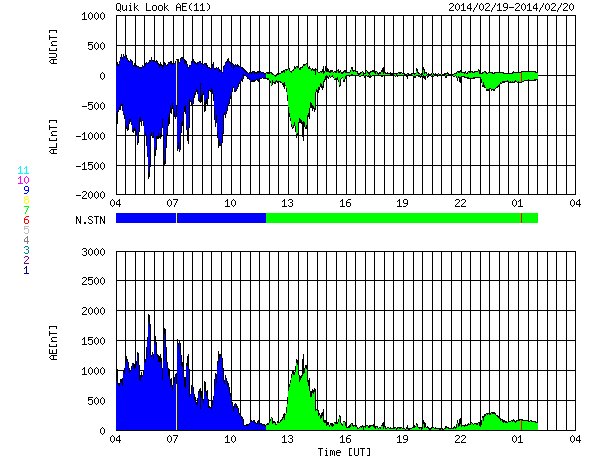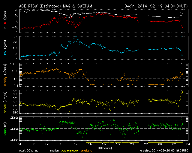 2014/ 2/20 12:20 更新 太陽風の次の擾乱が到来しました。再び磁気圏活動が強まりそうです。ロフォーテン諸島のオーロラをどうぞ。 担当 篠原 カナダの高坂さんより、 今回はノルウェー北部のロフォーテン諸島・オーという村で撮影された オーロラの写真をいただきました。 現在、現地に滞在中だそうで、 撮影は18日から19日にかけての夜とのことです。 昨日のニュースの前後に発生していたオーロラの写真です。 ロフォーテンでは、3日にわたって雨と曇りだったのが、 この夜から晴れ間が広がって来たそうです。 ちょうどよいタイミングで太陽風磁場が南向きに強まり、 活発なオーロラが発生したのでしょう。 ロフォーテン諸島は地形が特徴的で、 この写真でも村の背後に切り立った山が迫っています。 そこに被さるようにオーロラの輝きが広がっています。 今年のロフォーテンは暖冬だそうで、雪がとても少なく、 現在の気温は零下になっていないそうです。 太陽風の乱れによるオーロラの強まりに注目していた時の 素晴らしい写真をどうもありがとうございます。 太陽風磁場の南向きの強まりは、 昨日の夕方、19日17時(世界時19日8時)頃まで続きました。 その後しばらく0nT付近で変化して、 以降、北寄りに傾向が変わっています。 このため、磁気圏の活動も活発から静穏に変わっています。 AE指数のグラフは、前半は1000nTから最大で1500nTを越える様な 激しい変化をしていましたが、 後半は、スイッチが切れたように変化がなくなっています。 (実際、南向き磁場というスイッチが切れた訳です) 現在の太陽風は、速度は500km/秒と高速状態で、 磁場強度は10nTからゆっくりと5nTへ下がっていました。 しかし、ちょうど今、新たな擾乱が到達したようで、 速度は650km/秒に高まり、磁場強度も再び10nTに強まっています。 18日に発生したCMEによる乱れが到来したのかもしれません。 擾乱の到来と共に、太陽風磁場の南北成分は、 南向きに切り替わって、-5〜-10nTの範囲で変化しています。 このまま強い南向きが続くと、速度も一段と高まっていることもあり、 再び激しいオーロラの活動が始まるでしょう。 今後のACE衛星の太陽風データや、ライブカメラに注目して下さい。 太陽は、東の1982黒点群でC4.6の小規模フレアと、 その他にC1〜2の小さいフレアが数回発生しています。 ある程度の活動は続いています。