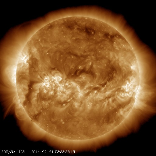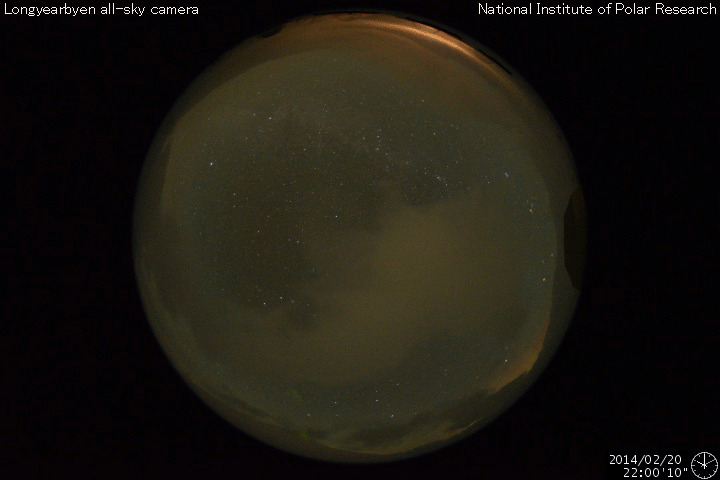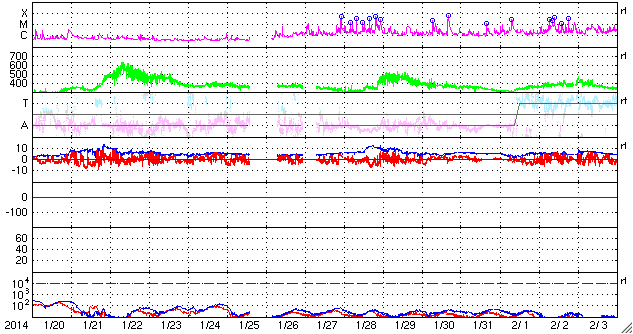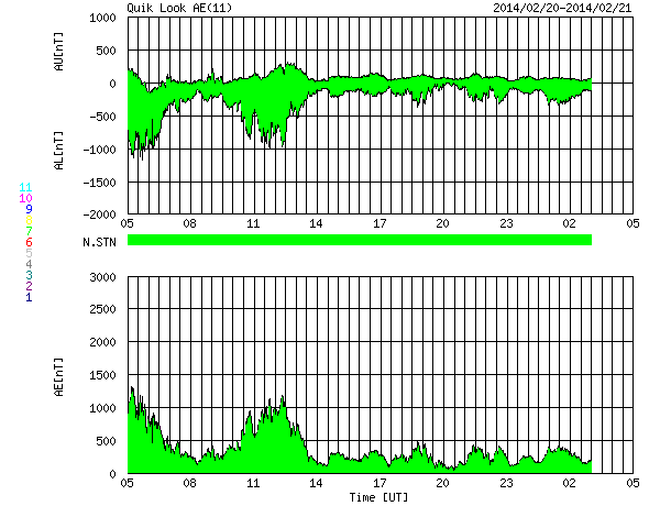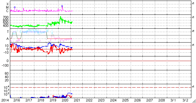 2014/ 2/21 13:12 更新 太陽風の乱れは終わりつつあります。アメリカとニュージーランドのオーロラ写真をどうぞ。 担当 篠原 大関翔輝さんより、 アメリカ合衆国ノースダコタ州グランドフォークスで、 現地18日23時半(世界時19日5時半)に撮影されたオーロラの写真をいただきました。 一昨日のニュースを書いた直後くらいのオーロラです。 ノースダコタ州は、アメリカ中北部のカナダに接するところで、 オーロラ帯よりも南に離れた地域です。 また、米戸 実さんより、 ニュージーランド・クィーンズタウンで撮影された 真っ赤なオーロラ写真をいただきました。 撮影は現地20日23時半です。 どちらも緯度の低めの地域の撮影で、 太陽風磁場の南向きが強まったために、 オーロラの活動する領域が普段よりも広がっていたのでしょう。 撮影日はずれていますが、 雪景色の北半球ノースダコタと夏本番のニュージーランドと、 南北両半球のオーロラそろい踏みとなりました。 素晴らしいタイミングでありがとうございました。 もうひとつ、ノルウェー・スバールバル島の 全天カメラのオーロラ動画も掲載します。 こちらは世界時20日22時のオーロラです。 天気がやや悪いのですが、 雲のすき間からオーロラのにぎやかな輝きが現れています。 太陽風は、昨日のニュースの後、 速度は700km/秒に高まり、磁場強度は15nTに強まりました。 磁場の南北成分は大きく南に振れ、 -10nTの強い南向きが9時間にわたって続いています。 このため、磁気圏の活動も高まり、 AE指数は1000nTを越える活発な変化を記録しています。 太陽風の乱れは、昨日の深夜くらいから徐々に弱まっていますが、 現在も速度は500km/秒と高速状態です。 磁場強度は5nTと平均的な値に戻っています。 磁気圏の活動は次第に落ち着いて、 現在は300nTの小規模の変化が起きている程度です。 太陽は西の端の1976黒点群でM3.0の中規模フレアが発生しました。 また、東の1982群でもC3.3の小規模フレアが発生しています。