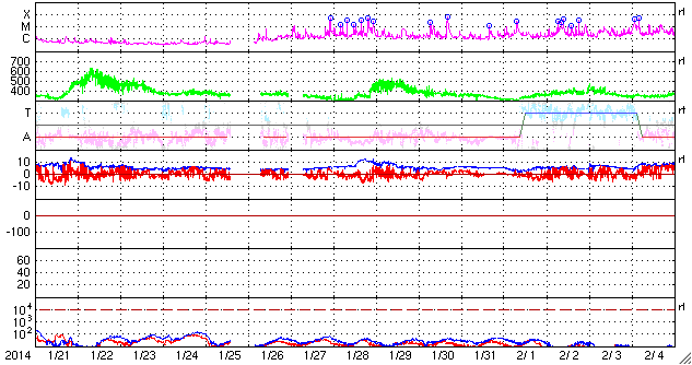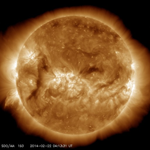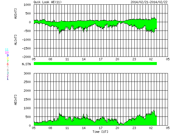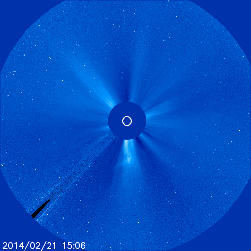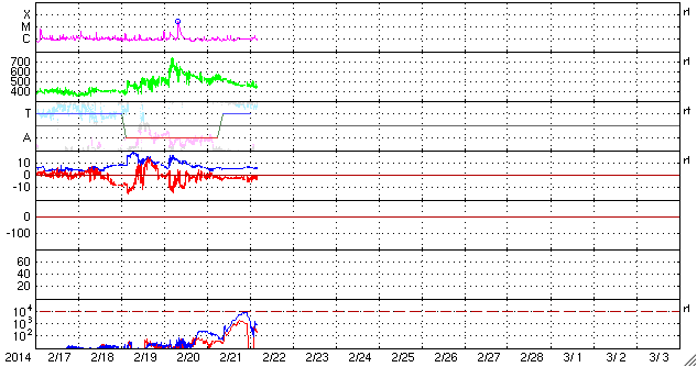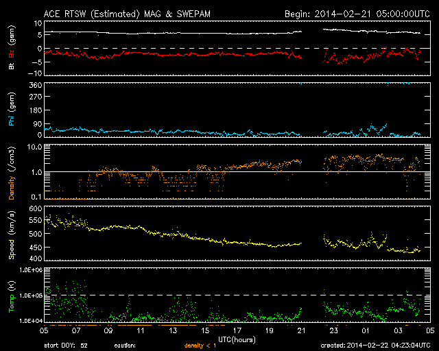 2014/ 2/22 13:23 更新 太陽風はやや高速です。ムルマンスクのオーロラ写真をどうぞ。 担当 篠原 ムルマンスクの福島さんより、 2月20、21日に現れたオーロラの写真をいただきました。 まさに、ソチ五輪フィギュア女子FPの中継を横目で見ながらの撮影だった様です。 1枚目は、ムルマンスクの隣のセヴェロモルスク市で ミロセルドフ・アルチョム氏により撮影されたオーロラです。 雪景色の空をオーロラの光が埋め尽くしています。 写真を横切るピンク色の光は何か分からないそうです。 2枚目は、クラースヌィフ・チムール氏による、 ムルマンスク市で撮影したオーロラです。 分厚い雲の晴れ間に、濃いオーロラの光が現れています。 2月のムルマンスクは、 気温がぐっと下がって好天に恵まれることが多いそうですが、 今年は曇天が続いているそうです。 今年のロフォーテン諸島は暖冬だという 一昨日の高坂さんの情報と繋がっているのかもしれませんね。 五輪の夜のすてきなオーロラ写真をどうもありがとうございます。 太陽風は、昨日のニュースの後に540km/秒くらいに少し高まり、 その後ゆっくりと下がって、 今日に入った頃から450km/秒とやや高速の風になっています。 磁場強度は、6nTと平均的な状態で安定しています。 磁場の南北成分は、-2nT程度と振れ幅は小さいですが、 ずっと南を向いています。 速度が高まっていることもあって、 磁気圏ではある程度の規模の活動が続いています。 AE指数では、500nT前後の中規模の変化がほぼ1日にわたって続いています。 激しくはなかったかもしれませんが、 極域ではにぎやかなオーロラが見られたかもしれません。 太陽風は少しずつ落ち着いてきています。 今日いっぱいくらいで速度も通常のレベルに下がるのではないでしょうか。 太陽は、1981、1982黒点群が中央に達して目立っています。 しかし、フレアの発生は特になく、活動度は高くない様です。 むしろ東の端や西の端で小さいフレアが度々発生しています。 特に、東端の向こう側に活動的な領域がある様で、 フレアを起こして、CMEを噴出させています。 SOHO衛星LASCO C3の動画を掲載します。 これは、1月の終わりから2月の初めにかけて大きな姿を見せていた、 1967黒点群が裏側を回って、再びこちら側に近づいている様です。 明後日くらいに姿を現すかもしれません。