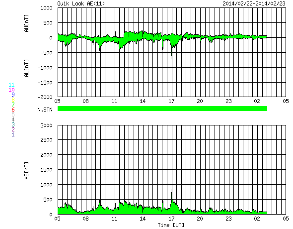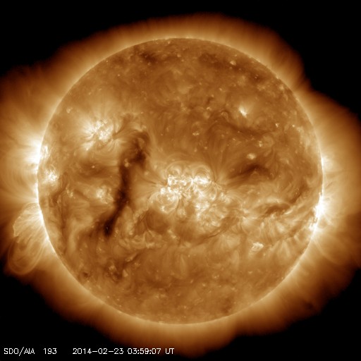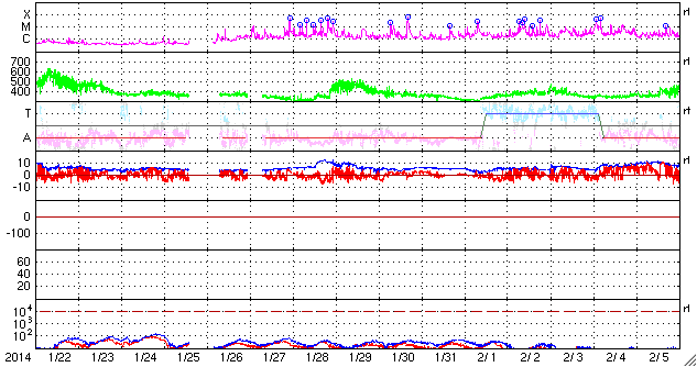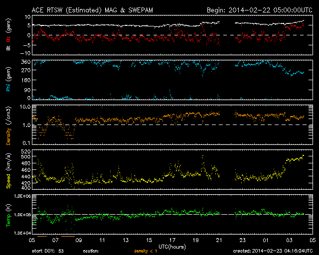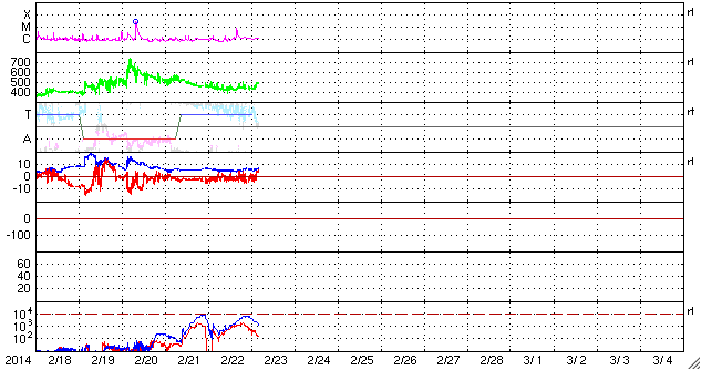 2014/ 2/23 13:16 更新 太陽風は高速になっています。太陽の東端の向こう側でフレアが発生しています。 担当 篠原 太陽風は、昨日から440km/秒とやや高速の状態が続いていますが、 先ほど、23日11時半(世界時23日2時半)に 小さい速度の変化が到来して、490km/秒へ上がっています。 磁場強度は、5nTでほぼ安定していて、 現在は、6nTに少しだけ上がっています。 磁場の南北成分は、 -1〜-2nT程度の弱い南向きが続いていました。 このため、AE指数のグラフでは、 300nTくらいの小規模の変化が度々発生しています。 そして、速度の変化以降、 南北成分は北向きに振れています。 この状況が続くと、磁気圏の弱い活動はなくなるでしょう。 太陽は、中央部で1982、1981黒点群がとても目立っています。 活動は穏やかで、C1.7の小さいフレアが起きた程度です。 一方、東端の向こう側で活動が続いています。 23日0時(世界時22日15時)には、C7.7のフレアが発生しました。 SDO衛星AIA131による動画を掲載します。 太陽の向こう側で起きた現象なので、 フレアの実際の規模はより大きかったと思われます。 そして、このフレアに伴って、 CME(太陽ガスの放出現象)も発生しています。 SOHO衛星LASCO C2の動画では、 左下に向かってガスが噴き上がっています。 この動画では、右下に向かって別のCMEが飛び出しています。 噴き出すガスの姿がダイナミックです。 こちらのCMEは、 太陽の裏側で発生したフィラメント噴出によるものです。 どちらのCMEも、地球への影響はありません。 東端の活動領域は、明日にも姿を見せるかもしれません。 ![]() 太陽の東端の向こう側で発生したC7.7のフレア。SDO衛星AIA131。 (c) SDO (NASA)、 (動画加工 : 宇宙天気ニュース) ![]() SOHO衛星LASCO C2カメラによる、太陽の東端から噴出するCME。 (c) SOHO (ESA & NASA)、 (動画加工 : 宇宙天気ニュース) ![]() SDO衛星のAIA193カメラによる太陽コロナの様子 (c) SDO (NASA) ![]() SDO衛星による太陽の可視光写真。マウスの矢印を写真に重ねると、黒点番号付きの写真に切り替わります。 (c) SDO (NASA) ![]() ACEが観測した太陽風の磁場(1番上の枠、白線は全体の強度、赤線は南北成分) および、太陽風の密度(3番目の橙線)、速度(4番目の黄線) (c) NOAA/SWPC ![]() リアルタイムAE指数 下段のAEグラフの値が高くなると、オーロラ活動が活発化しています。 (c) 京都大学, NICT ![]() 27日の太陽周期に合わせたデータプロット 太陽が同じ面を地球に向けていた27日前の変化から、今後を予想することができます。 (c) 作図:宇宙天気ニュース