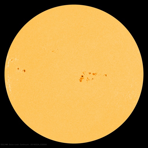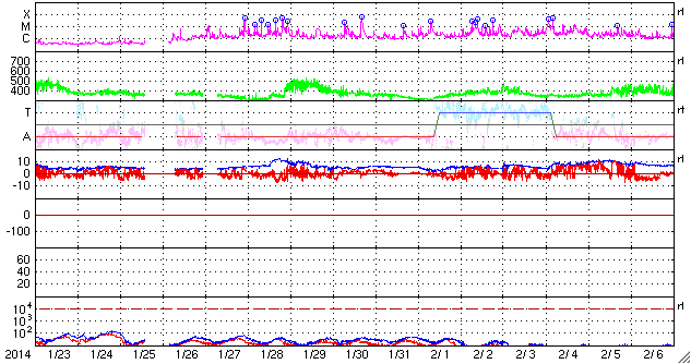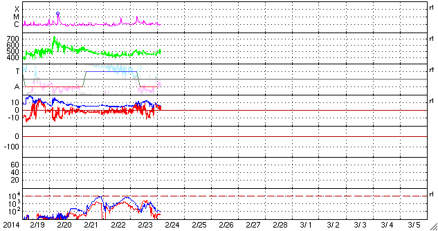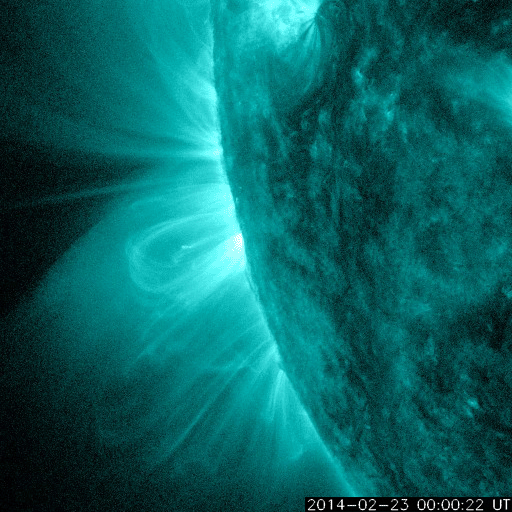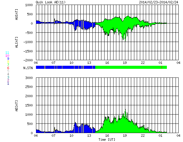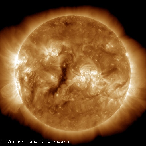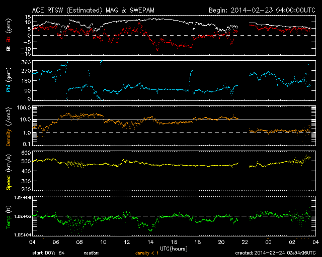 2014/ 2/24 12:32 更新 太陽風は500km/秒と高速です。太陽の東端で中規模フレアが発生しました。 担当 篠原 太陽風は、500km/秒と高速の状態が続いています。 磁場強度は、昨日のニュース以降に、 10nTを越えるくらいに強まる変化をして、 今朝、再び6nTへ戻っています。 磁場の南北成分は、グラフの初めは北寄りでしたが、 その後南向きに大きく振れて-10nTまで変化して、 終わりは北寄りに戻っています。 磁気圏の活動もこれに伴って変化し、 AE指数のグラフは、 中頃に1000nTに達する大きな変化が発生しています。 昨夜は、ライブカメラでも きれいなオーロラの活動を見ることができました。 太陽の東の端では、昨日に続いて、 23日15時(世界時6時)にM1.1の中規模フレアが発生しています。 SDO衛星AIA131の動画を掲載しますが、 昨日のCクラスフレアと同じ領域です。 発生した領域はこちら側に近づいている様ですが、 可視光写真では、黒点はまだ見えていません。 ![]() 太陽の東端の向こう側で発生したM1.1のフレア。SDO衛星AIA131。 (c) SDO (NASA)、 (動画加工 : 宇宙天気ニュース) ![]() SDO衛星のAIA193カメラによる太陽コロナの様子 (c) SDO (NASA) ![]() SDO衛星による太陽の可視光写真。マウスの矢印を写真に重ねると、黒点番号付きの写真に切り替わります。 (c) SDO (NASA) ![]() ACEが観測した太陽風の磁場(1番上の枠、白線は全体の強度、赤線は南北成分) および、太陽風の密度(3番目の橙線)、速度(4番目の黄線) (c) NOAA/SWPC ![]() リアルタイムAE指数 下段のAEグラフの値が高くなると、オーロラ活動が活発化しています。 (c) 京都大学, NICT ![]() 27日の太陽周期に合わせたデータプロット 太陽が同じ面を地球に向けていた27日前の変化から、今後を予想することができます。 (c) 作図:宇宙天気ニュース