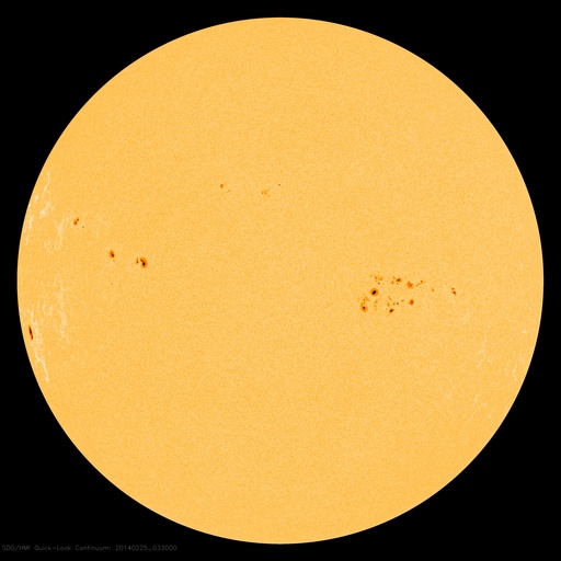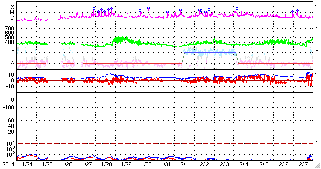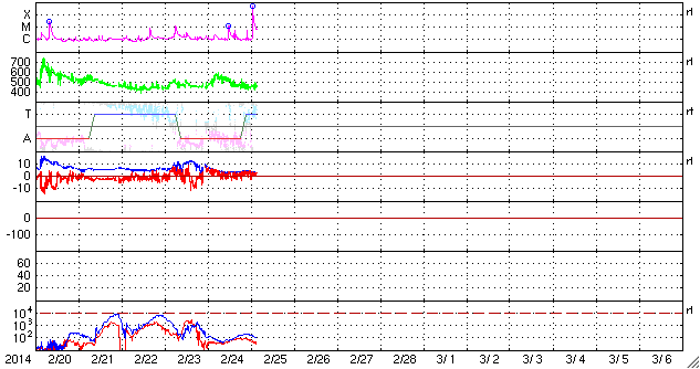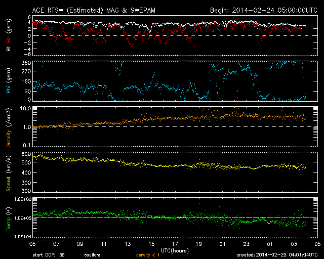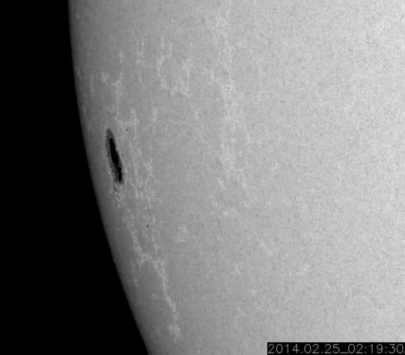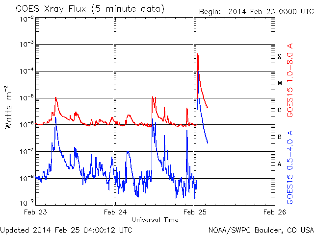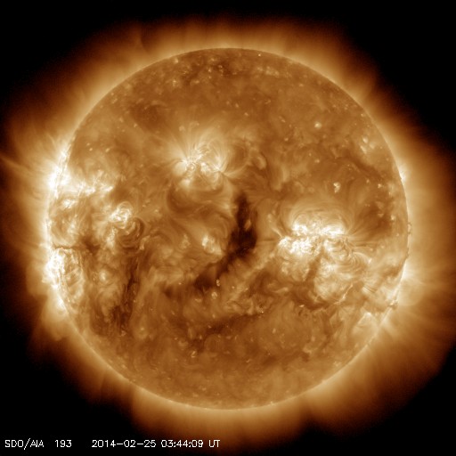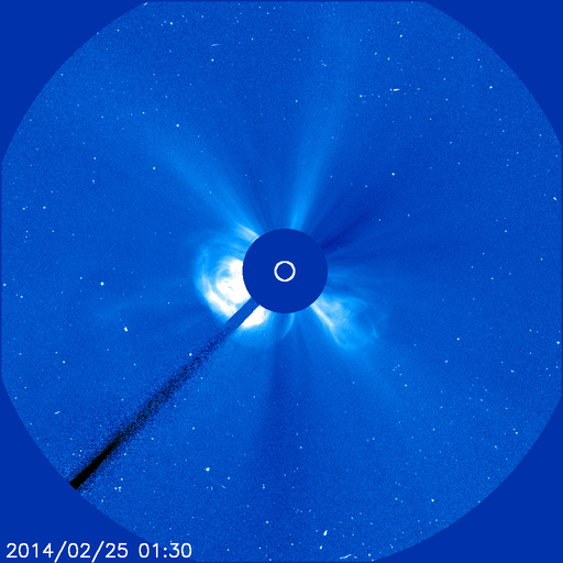 2014/ 2/25 13:02 更新 太陽の東端でX4.9の大規模フレアが発生しました。 担当 篠原 今朝、25日9時半(世界時25日0時半)に、 太陽の東端でX4.9の大規模フレアが発生しました。 SDO衛星AIA131による動画を掲載します。 Xクラスのフレアの発生は、1月7日(世界時)のX1.2以来です。 また、X5規模の大きさのフレアとしては、 2012年3月7日のX5.4以来、およそ2年ぶりの発生です。 発生したのは、ここ数日活動が目立っていた太陽の東端です。 可視光写真では黒点が姿を現しています。 CMEも発生していて、SOHO衛星LASCO C3では、 左下に向かって濃いガスの噴出が撮影されています。 まだ発生直後なので、CMEの広がる様子は明日紹介できるでしょう。 この黒点には1990黒点群と番号が付きました。 引き続き、この領域の活動に注目して下さい。 太陽風は、昨日のニュースの直後に、 速度が600km/秒近くに上がりましたが、 以降はゆっくりと低下して、現在は450km/秒とやや高速です。 磁場強度は、5nTから3nTに弱くなっています。 磁気圏では、小規模の変動が発生していて、 AE指数は300nTくらいの変化が数回発生しています。 SDO衛星AIA193の太陽コロナ写真では、 太陽の中心に細長いコロナホールが見えています。 3日後くらいにこの領域の影響が 太陽風に見られるかもしれません。 また、1990黒点群の活動によって、 規模の大きい太陽風の擾乱が到来する可能性もあります。