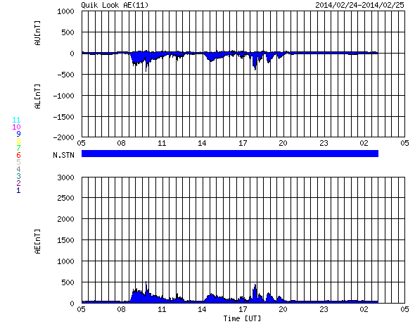 (c) SDO (NASA)、 (動画加工 : 宇宙天気ニュース) ![]() 太陽の東端から姿を現した1990黒点群。SDO衛星。 (c) SDO (NASA) ![]() Xフレアに伴って左下に向かって噴出したCME。SOHO衛星LASCO C3。 (c) SOHO (ESA & NASA) ![]() SDO衛星のAIA193カメラによる太陽コロナの様子 (c) SDO (NASA) ![]() SDO衛星による太陽の可視光写真。マウスの矢印を写真に重ねると、黒点番号付きの写真に切り替わります。 (c) SDO (NASA) ![]() GOES衛星の太陽X線データ (c) NOAA/SWPC ![]() ACEが観測した太陽風の磁場(1番上の枠、白線は全体の強度、赤線は南北成分) および、太陽風の密度(3番目の橙線)、速度(4番目の黄線) (c) NOAA/SWPC ![]() リアルタイムAE指数 下段のAEグラフの値が高くなると、オーロラ活動が活発化しています。 (c) 京都大学, NICT ![]() 27日の太陽周期に合わせたデータプロット 太陽が同じ面を地球に向けていた27日前の変化から、今後を予想することができます。 (c) 作図:宇宙天気ニュース
