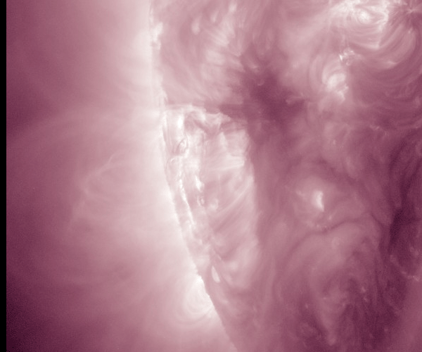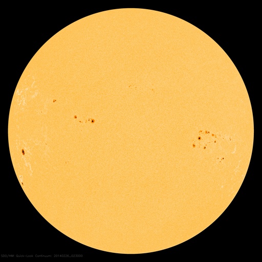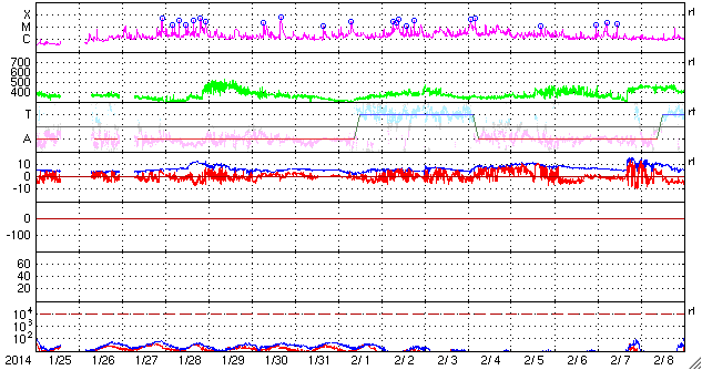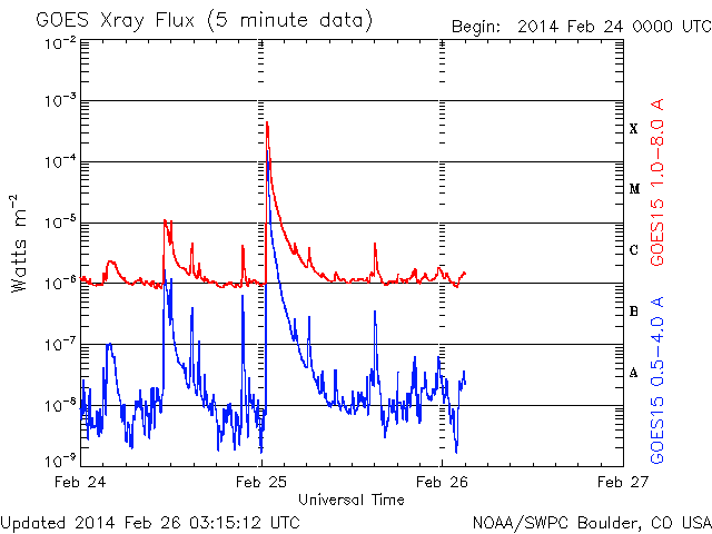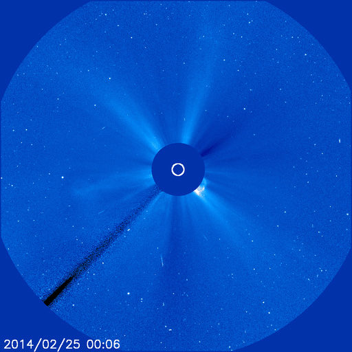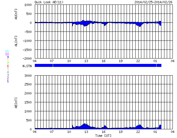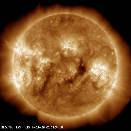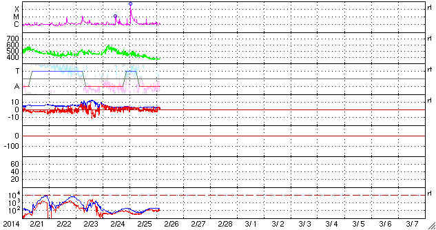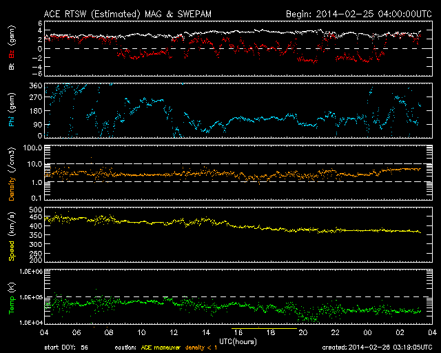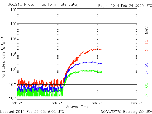 2014/ 2/26 12:19 更新 X4.9フレアのCMEにより、明日くらいに太陽風の乱れが到来する可能性があります。 担当 篠原 昨日のX4.9フレアの動画では、 SDO衛星AIA131の写真に一枚だけ、 人の姿の様な面白い形をしたプロミネンスが写っていました。 興味深かったので、SDO衛星の他のAIAカメラの写真を調べると、 前後の時間の写真が撮られていたので、 それらを繋げて動画を作ってみました。 AIAカメラにいくつも種類があるのは、 異なる波長を使うことで、コロナの異なる様子を撮影するためです。 (撮影できる温度や領域についてては、英語ですが Wikipedia を) 従って、これらをまとめて繋げてしまうのは無理があると思いますが、 それでも、吹き飛んでいく前後の様子が良く見えるので、 注意しながらご覧下さい。 こういう動画は初めて作ってみたのですが、面白いですね。 さて、この大規模フレアに伴って CME(太陽ガスの放出現象)が噴出しています。 SOHO衛星の写真が揃ったので、LASCO C3の動画を掲載します。 主に左下に向かって噴き出していますが、 規模が大きいため、地球方向にもある程度向かっている様です。 NOAA/SWPCの太陽風予測でも、 飛び出したプラズマの塊の端の部分が地球に達しています。 到来は、発生から2日後となる、 明日、27日の朝頃になりそうです。 太陽風速度の高まりに注目するとともに、 太陽風の磁場がどのくらい強まり、南向きに振れるかに注意して下さい。 大きく南向きに振れた場合、速度の高まりも重なって、 激しい磁気圏活動をもたらす可能性があります。 新月に近いので、オーロラを観望するには良い条件です。 フレアの発生がもう数日遅ければ、 地球への影響もより大きなものになったでしょう。 太陽では、その後1990黒点群は特にフレアを起こしておらず、 1989群でC5.0、1986群でC4.5、C5.7が起きているくらいです。 引き続きフレアの発生に注目して下さい。 太陽風は、ゆっくりと速度を下げて、 370km/秒と低速の風に変わりつつあります。 磁場強度も3nTと弱まっています。 磁場の南北成分は、 振れ幅は小さいですが、南北に変化していて、 その影響でAE指数も小さく変化しています。 昨日紹介したように、 SDO衛星AIA193の中心部に見える コロナホールの影響も注目されますが、 CMEによる擾乱が到来すれば、太陽風は乱れた状態が続くでしょう。 X4.9のフレアによって、 太陽放射線(非常に高速の陽子)も増加しています。 警戒レベルの10を越えて、20くらいに達しています。