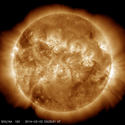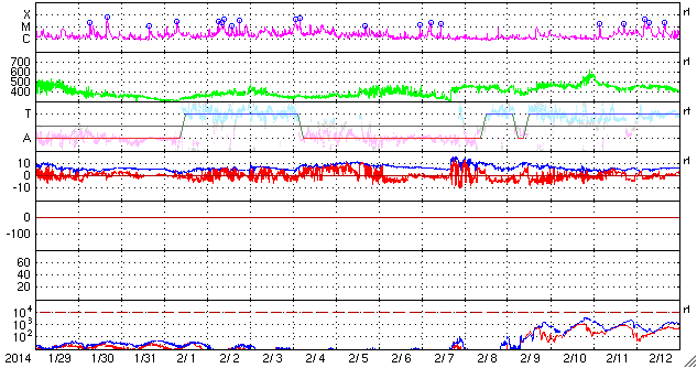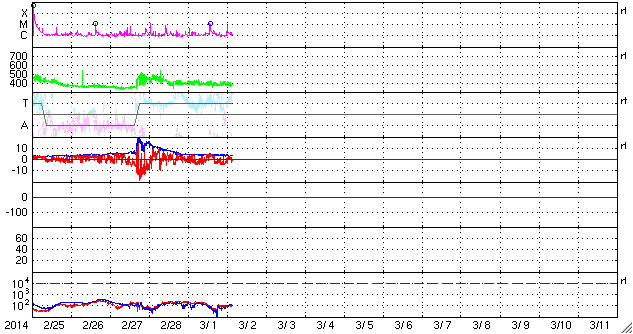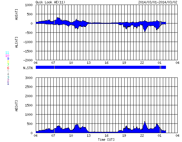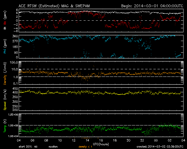 2014/ 3/ 2 12:40 更新 太陽風は平均的な状態です。フィンランドのオーロラをどうぞ。 担当 篠原 春や秋にフィンランドのオーロラ写真を送って下さっていた 谷口直樹さんより、この春の(季節としての春はまだ先ですが) フィンランドのオーロラ写真が届きました。 (以前の写真は、こちらの読者写真集よりどうぞ) 2月20日から25日にかけて、 フィンランドのサーリセルカでの撮影だそうです。 滞在期間全般に天気が悪く、 車で移動を繰り返しながらの観測となったそうです。 その様な状況でしたが、20日と25日には派手なオーロラが現れ、 22日、23日にも雲の切れ間から観測ができて、 満足の行く旅になったとのことです。 寒さは厳しく、2枚目の写真の時は -27度まで下がったそうです。 写真に見える縦にまっすぐ伸びる光は、光柱だそうです。 (Wikipediaをどうぞ) 谷口さんは初めてだったそうで、最初は喜んだものの、 やがてオーロラ撮影の邪魔になったとのことです。 4枚目の写真は、オーロラのすぐ隣りにすばる(プレアデス星団)が見えています。 きれいなオーロラの写真をありがとうございます。 この期間の太陽風や磁気圏の状況は比較的良かったようで、 連日の観測成功おめでとうございます。 現在の太陽風は、平均的な状態で安定しています。 昨日より、速度は400km/秒、磁場強度は4nTでほぼ一定です。 磁場の南北成分は、 数時間ごとに南寄り、北寄りと切り替わっています。 このため、AE指数のグラフを見ると、 磁気圏の活動も数時間ごとに強まったり、弱まったりと 切り替わっています。 SDO衛星AIA193にはコロナホールは見られず、 太陽風は穏やかに推移しそうです。 太陽は、西に沈んでいった1982黒点群で、 昨夜、1日22時半(世界時1日13時半)に M1.1の中規模フレアが発生し、 今朝、2日9時(世界時2日0時)にも C8.7の小規模フレアが起きています。 西に没しかけての現象なので、 実際の規模はもう一段上だったかもしれません。 1982群は見えなくなったので、今後の影響はありません。 残った黒点では、1987群でC3.1の小規模フレアが起きています。 太陽放射線は、ゆっくりと低下しています。