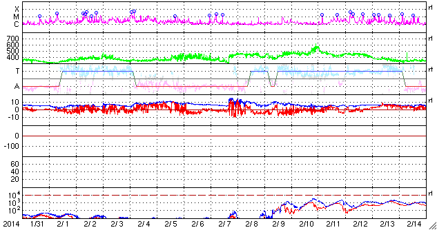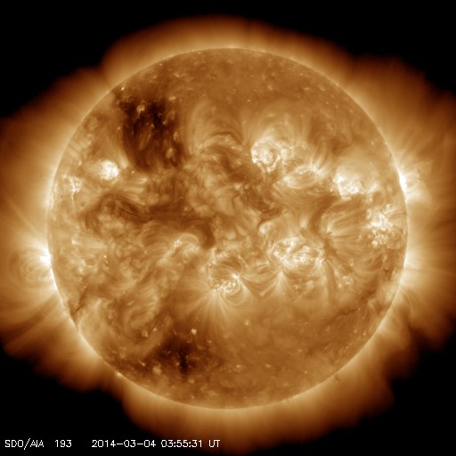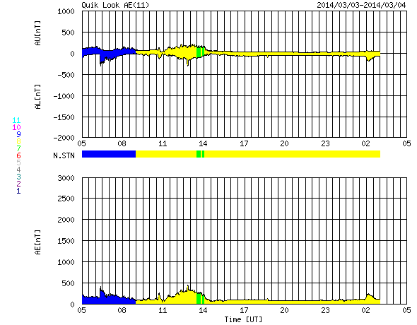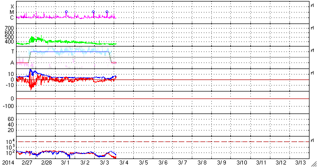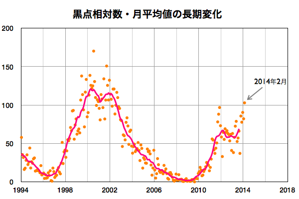 2014/ 3/ 4 13:05 更新 太陽風は低速です。2月の黒点数は102.8でした。フィンランドのオーロラをどうぞ。 担当 篠原 SIDCより、2月の黒点相対数が発表され、 102.8と、今期初めて100台に達しました。 これまでの最大は2011年11月の96.7で、 大台まであと一歩だったのですが、 今回、とうとう100の線を越えました。 1994年以降の20年間のグラフを掲載します。 1997年から始まる黒点数の高まりが第23活動周期、 続いて、2009年から始まる高まりが現在の第24活動周期です。 山の高さは半分ほどしかありませんが、 第24期の変化の様子は第23期とよく似ています。 すると、今年の後半には下り坂が始まるのかもしれません。 続いて、フィンランドから届いたオーロラの写真です。 2月末からフィンランドの北方、イバロという町で オーロラ観測の旅をされている 永長英夫さんと中田昌さんからオーロラの写真をいただきました。 今日は、2月24日から28日にかけての写真を掲載します。 今年のラップランドは暖冬でとても天候が悪いそうですが、 晴れ間さえ見つけられれば、 こうして毎日のようにオーロラを楽しむことができるのですね。 一昨日に掲載した谷口さんの写真と重なる日程の写真で、 場所も近く、距離は30kmほどとのことです。 きれいな写真をどうもありがとうございます。 また明日、続きの写真を紹介する予定です。 太陽風は、350km/秒と低速の風が続いています。 磁場強度は5nTから一時的に2nTに下がっていますが、 現在は元に戻っています。 太陽風磁場のセクターの切り替わりがやってきた様で、 27日周期の図を見ると、「T」から「A」に変わっています。 この切り替わりに関係して、特に目立った変化は起きていません。 磁気圏は静穏で、 AE指数は前半に小さい変化が起きていますが、 後半は全く変化していません。 SDO衛星AIA193を見ると、太陽の東側の南北両半球の高緯度域に それぞれコロナホールが見えています。 明日には太陽の中心線近くに届きそうです。 今週後半は、この領域からの高速太陽風がやって来るかもしれません。 太陽は、1989黒点群でM1.2の中規模フレアが発生し、 その他にもC1〜4の小規模フレアが10回程度、 太陽のあちこちで発生しています。 GOES衛星のX線写真の動画を見ていると、 それぞれの黒点群で頻繁に活動を起こしています。 この後も、Cクラス、Mクラスのフレアが続きそうです。