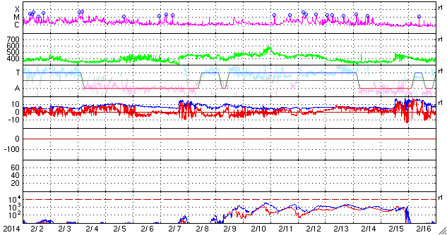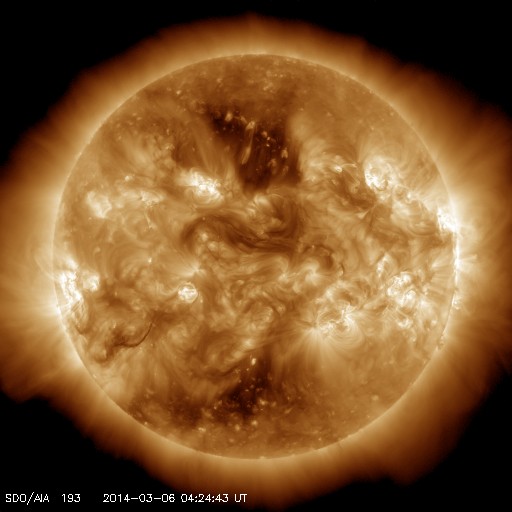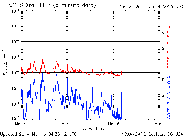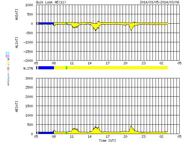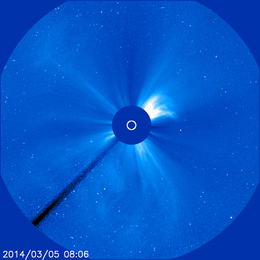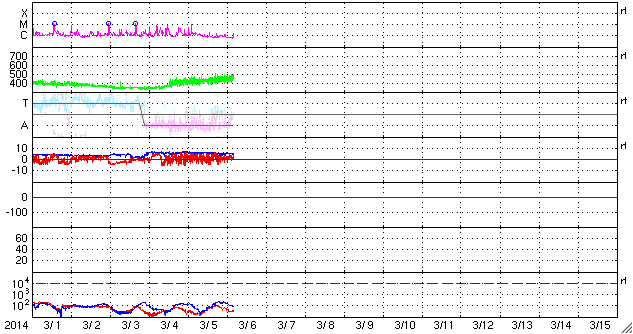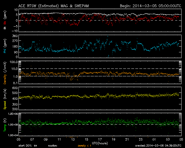 2014/ 3/ 6 13:39 更新 太陽は穏やかになっています。太陽風はやや高速です。 担当 篠原 太陽の裏側で、活発に活動が発生している様です。 SOHO衛星LASCO C3の動画を見ると、 CMEが次々と太陽から噴き出しています。 太陽の裏側を観測しているSTEREO衛星によると、 フレアやフィラメント噴出などが続いている様です。 一方、太陽のこちら側は、昨日から静かになっていて、 C1〜2の小さいフレアが5〜6回発生した程度です。 太陽風は、速度が470km/秒と高速の状態になりつつあります。 前周期に見られた太陽風の高まりが、 少し強まって回帰している様です。 磁場の南北成分は、北向きから時々南向きに振れています。 これに対応して、磁気圏では時間をおいて、 AE指数300nTほどの小規模の変化が発生しています。 SDO衛星では、 コロナホールが太陽の中心線を通過しているところです。 明後日くらいから、この領域の影響で、 太陽風の速度が高まるかもしれません。 現在の変化とどのように繋がっていくのか、注目して下さい。 明日、7日から10日まで、 種子島で行われるロケットコンテストに参加します。 部活動の学生引率です(本人も楽しんでいますが)。 このため、記事の更新はしばらく不安定になります。 ![]() SOHO衛星LASCO C3による、太陽の裏側で発生しているCME。 (c) SOHO (ESA & NASA)、 (動画加工 : 宇宙天気ニュース) ![]() SDO衛星のAIA193カメラによる太陽コロナの様子 (c) SDO (NASA) ![]() SDO衛星による太陽の可視光写真。マウスの矢印を写真に重ねると、黒点番号付きの写真に切り替わります。 (c) SDO (NASA) ![]() GOES衛星の太陽X線データ (c) NOAA/SWPC ![]() ACEが観測した太陽風の磁場(1番上の枠、白線は全体の強度、赤線は南北成分) および、太陽風の密度(3番目の橙線)、速度(4番目の黄線) (c) NOAA/SWPC ![]() リアルタイムAE指数 下段のAEグラフの値が高くなると、オーロラ活動が活発化しています。 (c) 京都大学, NICT ![]() 27日の太陽周期に合わせたデータプロット 太陽が同じ面を地球に向けていた27日前の変化から、今後を予想することができます。 (c) 作図:宇宙天気ニュース
