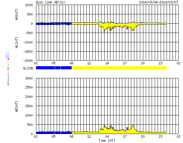 2014/ 3/ 7 10:02 更新 太陽風、太陽は比較的穏やかです。カナダのオーロラと大火球写真をどうぞ。 2014/ 3/ 7 10:09 追加 太陽風のグラフを追加します 担当 篠原 カナダに戻った高坂雄一さんより、 イエローナイフのオーロラと火球の写真が届きました。 現地5日23時から6日3時過ぎまでオーロラの活動が続き、 零下38度というものすごい寒さの中で、 休むこともできず撮影を続けたそうです。 その中、6日の2時13分にとても明るい流星が流れ始め、 どんどん明るくなり爆発しながら北の空へ沈んでいったそうです。 目の前でフラッシュを焚いた様なものすごい明るさで、 周りは真っ白になり、目を閉じてしまうほどだったそうです。 数分後に、沈んでいった方向から何かが爆発したような、 とてつもなく大きな音が聞こえて来たそうです。 高坂さんによると、ソニックブームかもしれないとのことです。 色の分かれたきれいなオーロラに大火球が重なって、 ものすごい写真になっています。 雪原もとても明るく写っていて、ロシアの大隕石を思い出します。 貴重な写真をどうもありがとうございます。 太陽風は、450km/秒とやや高速の状態が続いています。 磁場強度は5nTと平均的な値です。 磁場の南北成分は、北寄り、南寄り、北寄りと変化していて、 これに対応してAE指数のグラフは、 中央付近に小規模の変化が発生しています。 SDO衛星AIA193のコロナホールは、 太陽の中央線を通り過ぎたところで、 明日くらいから影響が及び始めるとすると、 現在のやや高速の太陽風がそのまま続くのかもしれません。 太陽は、目立ったフレアの発生はなく静穏になっています。 黒点も次第に目立たなくなっています。 これから高速船に乗って種子島にわたります。 今日はとても天気が良く、 この好天が明日まで続いて欲しいです。 2014/ 3/ 7 10:09 追加 (篠原) 関連の図はページの最後にあります 図の掲載に失敗しました。