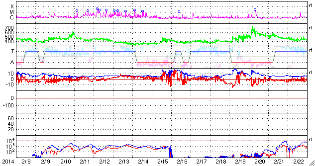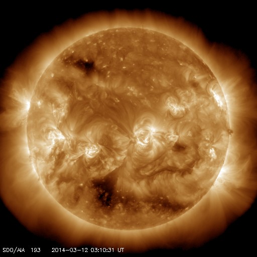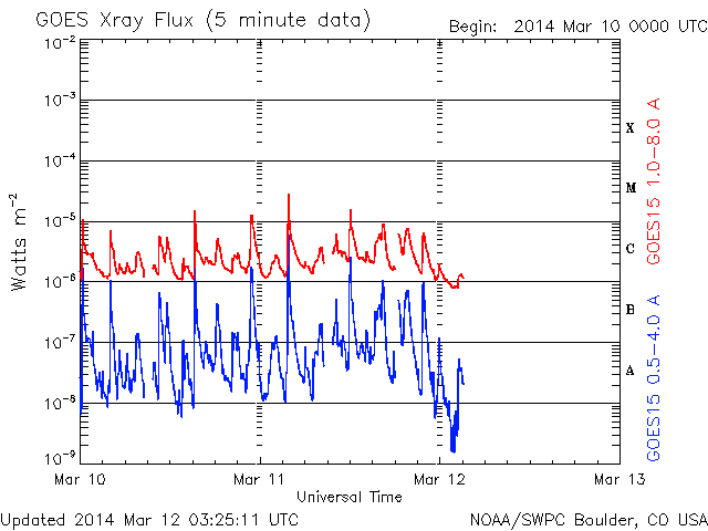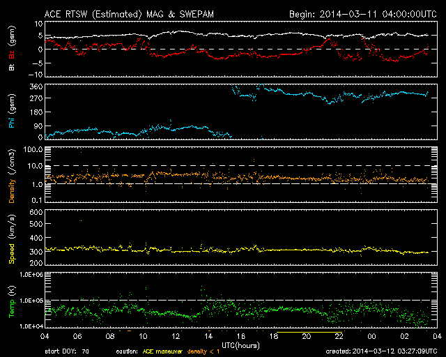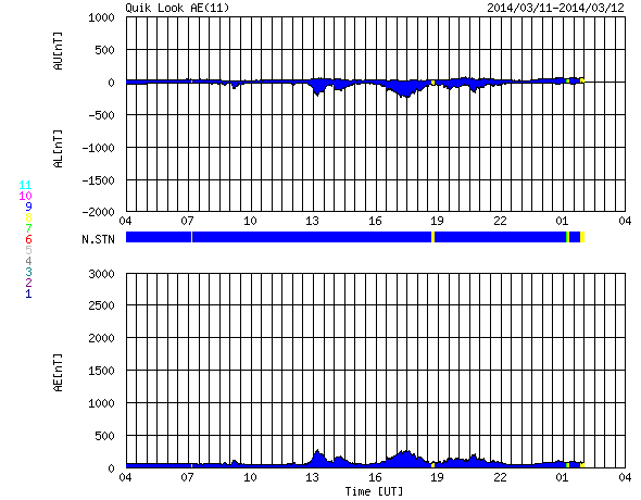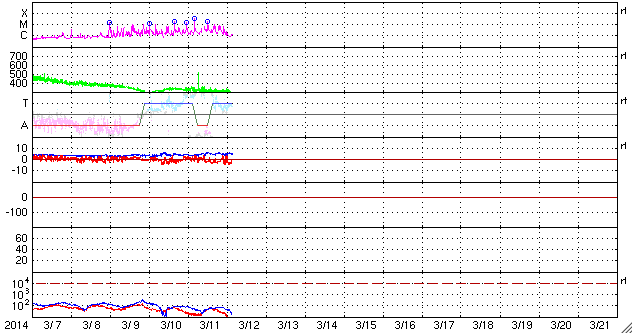2014/ 3/12 12:27 更新 太陽のフレアの発生は続いています。イエローナイフのオーロラをどうぞ。 担当 篠原 新宅宏章さんより、3月4〜6日にカナダのイエローナイフで撮影された オーロラの写真をいただきました。 撮影後すぐに送って下さっていたのですが、 種子島へ行っていたため、掲載が今日に遅れてしまいました。 1枚目は、3月7日のニュースで紹介した大流星が写っています。 明るさや色合いの変化がそっくりです。 先日の高坂さんは、流星を横から見ていますが、 新宅さんは進行方向から撮っていた様です。 一瞬のできごとを2つの場所から同時に捉えていて、 見比べると一段とすごさを感じます。 2枚目は3月6日、3枚目は5日のオーロラです。 新宅さんによると、どちらのオーロラも出現時間は短かったものの、 そこそこの動きを見せてくれたそうです。 オーロラの躍動する姿が見事ですね。 明日も、新宅さんの続きの写真を紹介する予定です。 太陽風は、速度が300km/秒に下がって、 かなり遅くなっています。 磁場強度は、5nTと平均的な状態です。 磁場の南北成分は、-2nTと振幅は小さいですが、 南寄りに振れるようになっています。 このため、AE指数も小さい変化が発生していて、 グラフの後半は100〜200nTの弱い変化が続いています。 太陽風は、しばらく穏やかな状態が続きそうです。 太陽では、フレアの発生が続いています。 昨日のニュースの頃に、1996黒点群でM3.5の中規模フレアが発生し、 その後、南西の端(右下)で、C6.7、M1.7のフレア、 南東(左下)の2002黒点群でC9.7、再び1196群でC6.9と、 Mクラスから大きめのCクラスにかけて、 太陽のあちこちでフレアが発生しています。 その様子を、GOES衛星のX線カメラの動画でご覧下さい。 上記以外にもあちこちで小さい輝きが起きています。 西端で見られた活動は、今後は見えなくなり、 1996群もやがて没します。 今後は2002群中心の活動になりそうです。