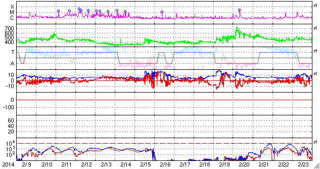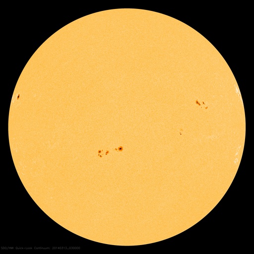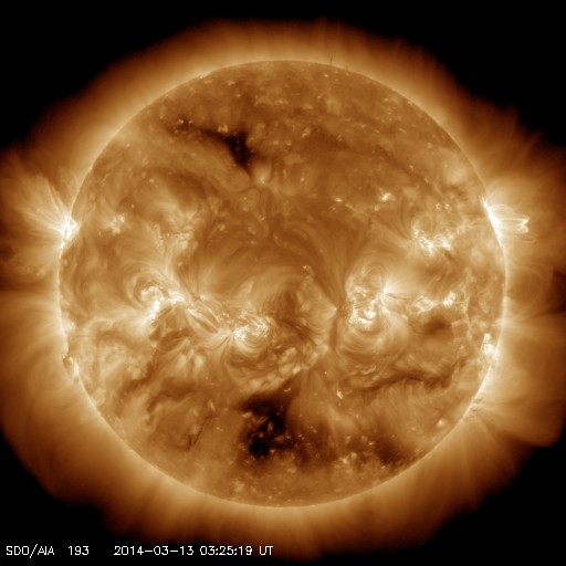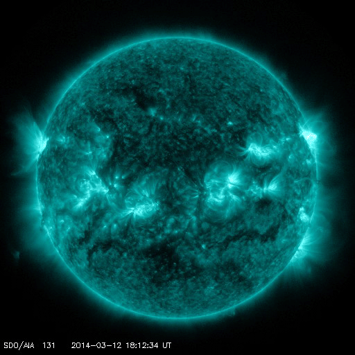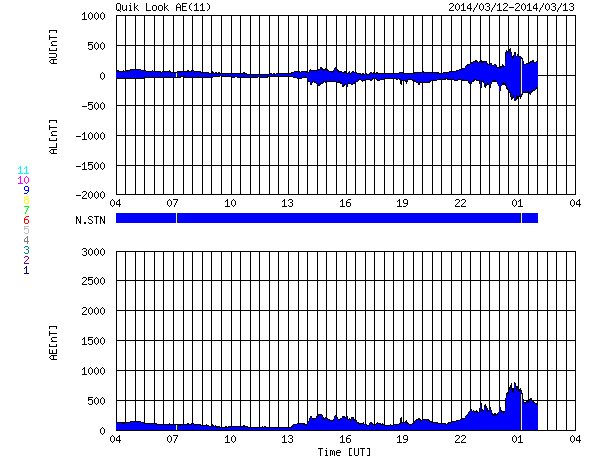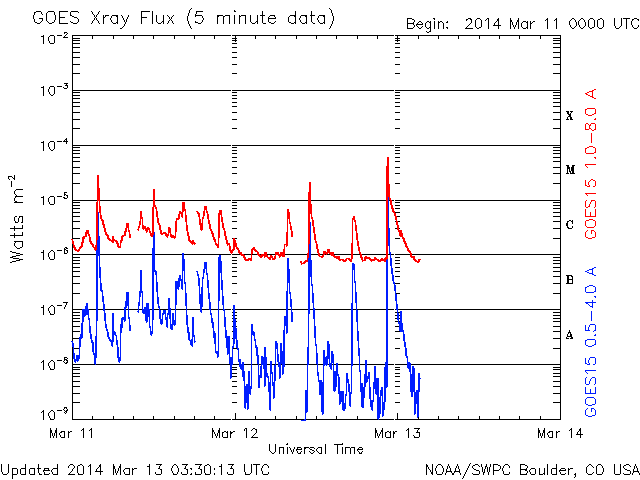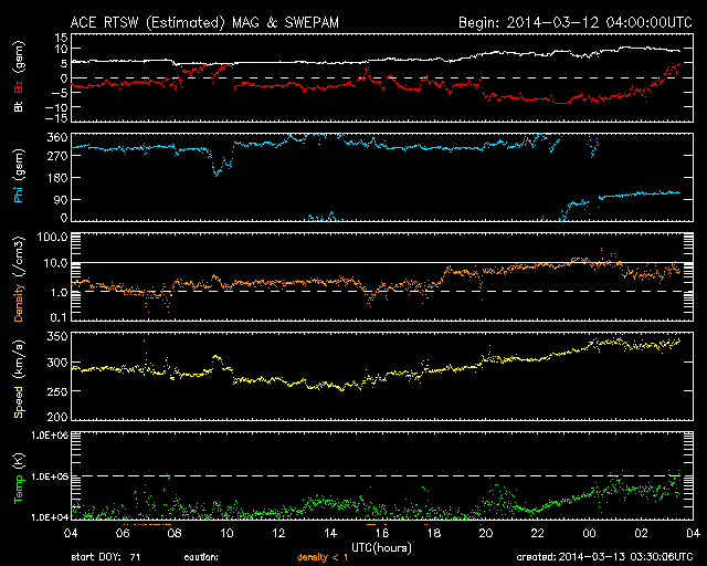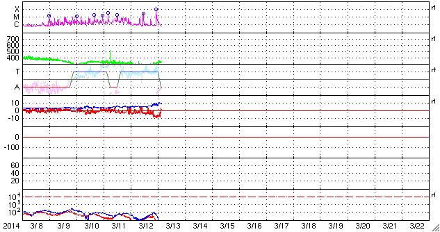 2014/ 3/13 12:31 更新 M9.3と大きい中規模フレアが発生しました。イエローナイフのオーロラをどうぞ。 担当 篠原 太陽の北西(右上)で活発に活動していた1996黒点群で、 今朝、13日7時半(世界時12日22時半)に、 M9.3と大きいMクラスのフレアが発生しました。 フレアの様子を、SDO衛星AIA131の動画で紹介します。 このフレアの直後に、すぐ南側でフィラメントの噴出も起きています。 AIA304の写真でその様子を見ることができます。 1996黒点群は、昨夜、12日20時(世界時12日11時)にも M2.5の中規模フレアを起こしていました。 活発な活動が注目されますが、現在はもう西の端に沈みつつあり、 今後、地球への影響はないでしょう。 一方、2002黒点群はC1.4の小さいフレアを起こしたくらいで、 活動は静かになっています。 また、2003黒点群が発達を続けています。 今後、フレアを起こすようになるかもしれません。 昨日に続いて、新宅宏章さんから送っていただいた、 カナダ・イエローナイフのオーロラ写真を紹介します。 日付はさかのぼって、3月4日未明のオーロラです。 雪景色の上を激しくオーロラの光が舞っています。 シルエットになった木々が印象的です。 3枚目の写真は、夜明けの空に消えゆくオーロラです。 オーロラの赤みと、夜明けの赤みなど、 微妙な色合いの変化がとてもきれいです。 零下40度という非常に厳しい寒さの中での撮影だったそうです。 美しいオーロラ写真を、どうもありがとうございました。 太陽風は、速度は330km/秒と、昨日よりは少し上がりましたが、 低速風が続いています。 磁場強度は、今日未明くらいから強まって、 10nTに上がっています。 磁場の南北成分が、-8nTくらいに強まり、 AE指数も700nTと変化がやや強まっていました。 しかし、最新のデータでは、磁場は北向きに切り替わりつつあり、 この傾向が続くなら、磁気圏の活動は弱まって穏やかになるでしょう。