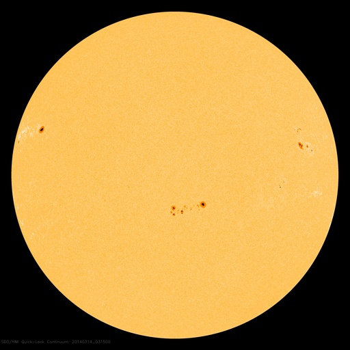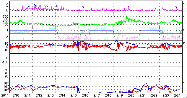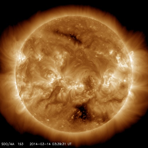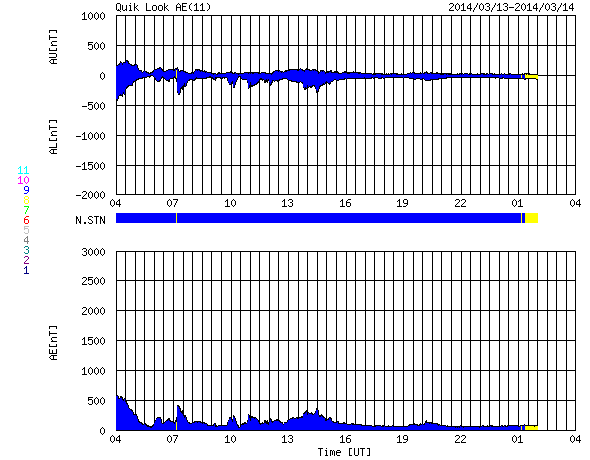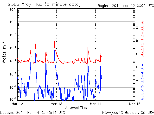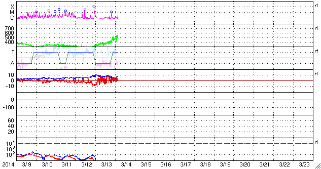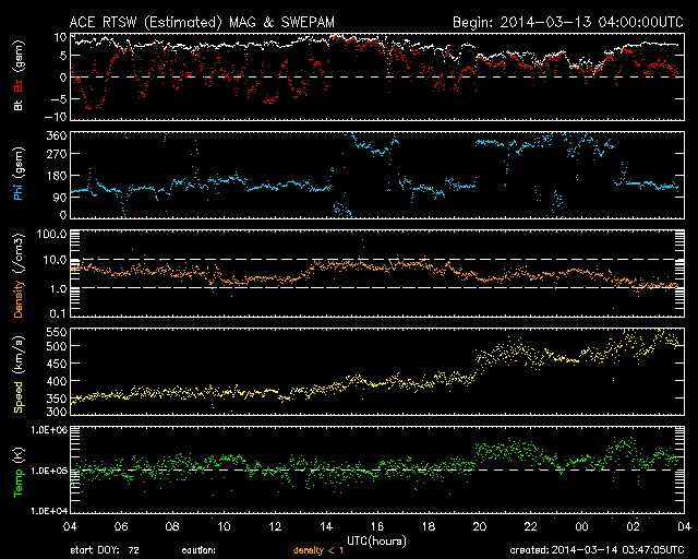 2014/ 3/14 12:47 更新 太陽のフレアは少なくなっています。太陽風は高速風に変わりました。 担当 篠原 活発にフレアを起こしていた1996黒点群が、 太陽の西に没していきました。 その最後に、M1.2の中規模フレアを、 今朝、14日4時(世界時13日19時)に起こしています。 その様子を含めて、太陽のフレア活動を GOES衛星のX線カメラの動画で紹介します。 右上の端の明るい領域が1996黒点群です。 その隣の2003黒点群でも小さい変動がいくつか起きています。 1996群が見えなくなったので、 フレアの発生は少なくなりそうです。 太陽風の速度は、昨日から今日にかけて、 350km/秒から400km/秒へと少し上がっていたのですが、 今朝、14日5時(世界時13日20時)頃から本格的に高まって、 現在は、500〜550km/秒と高速風に変わっています。 太陽の南半球の高緯度側に広がっていたコロナホールの影響が、 及ぶようになったのかもしれません。 磁場強度は、5nTと10nTの間を変化していて、 現在は8nTとやや強まっています。 オーロラの活動度を示すAE指数は、 グラフの前半に小さい変化が見られますが、 太陽風の速度が上がってきた後半は静かになっています。 太陽風磁場の南北成分が北寄りに変わってきたためでしょう。 太陽風の高まりは、27日前の前周期には見られませんでした。 (1日ほど後に、CMEに関係した変化は来ていますが) このため、今後どのように推移するのか注目して下さい。 SDO衛星AIA193では、 コロナホールの広くなった領域が、西半球に進んでいます。 このまま、この領域の影響に繋がっていくのかもしれません。