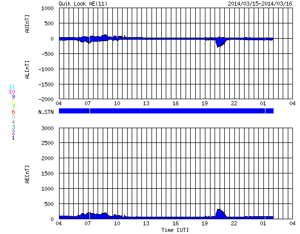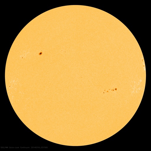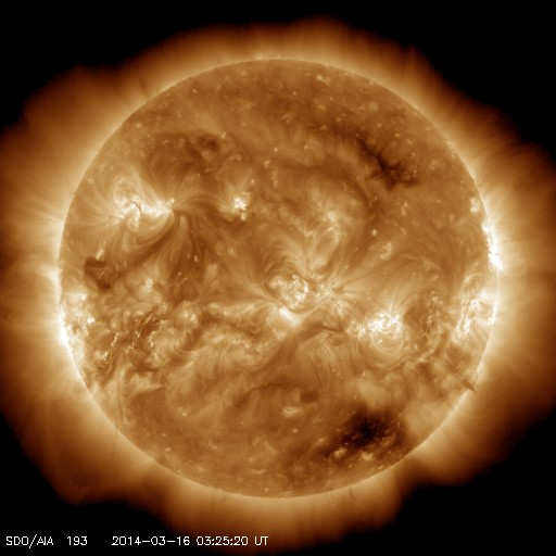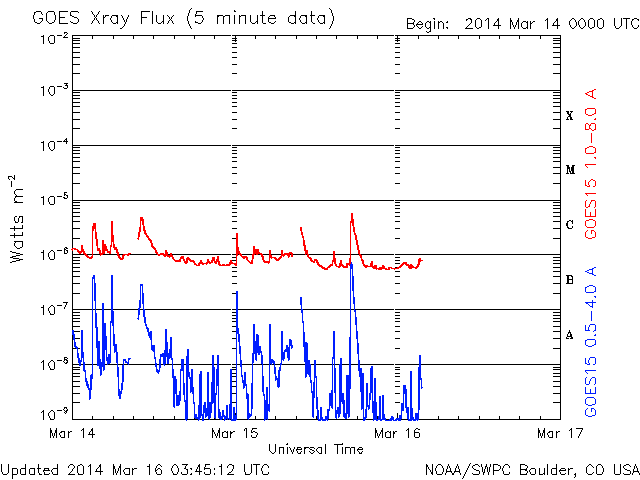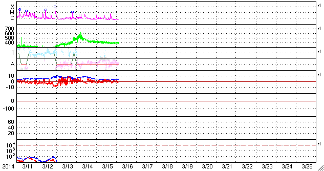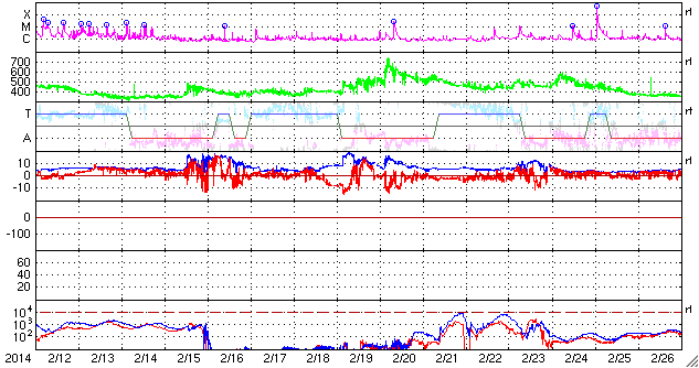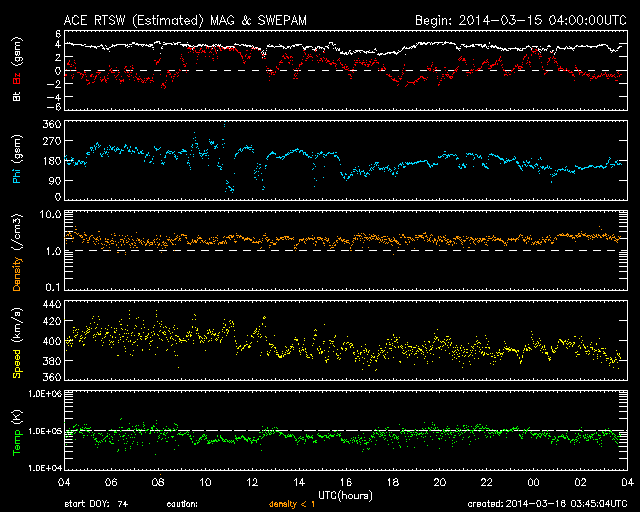 2014/ 3/16 12:46 更新 太陽は穏やかになりそうです。太陽風は平均的な状態が続いています。 担当 篠原 太陽の西に没しかけた2003黒点群で、 昨夕、15日18時半(世界時15日9時半)にC5.0、 深夜、16日2時(世界時15日17時)にC6.1の 小規模フレアが発生しています。 可視光写真では、2003群は太陽の端ぎりぎりに達していて、 すぐに見えなくなりそうです。 このため、太陽のフレアの発生は少なくなりそうです。 太陽風の速度は、昨日より400km/秒前後と 平均的な速さで安定しています。 磁場強度も4nT程度と平均的な状態で、 穏やかな太陽風が続いています。 磁場の南北成分は比較的北寄りです。 このため、磁気圏も概ね静穏で、 オーロラの活動度を示すAE指数のグラフは、 ほとんどの時間帯で変化が見られません。 SDO衛星AIA193の太陽コロナ写真で 太陽の南北に見えていたコロナホールは、 太陽の西側(右側)にだいぶ移動しています。 今日、明日くらいに弱い影響が見られるかもしれませんが、 それがなければ穏やかな太陽風がしばらく続きそうです。 今日から水曜日まで、研究会に参加するため福岡に行きます。 3日ほど更新が不安定になります。 ![]() SDO衛星のAIA193カメラによる太陽コロナの様子 (c) SDO (NASA) ![]() SDO衛星による太陽の可視光写真。マウスの矢印を写真に重ねると、黒点番号付きの写真に切り替わります。 (c) SDO (NASA) ![]() GOES衛星の太陽X線データ (c) NOAA/SWPC ![]() ACEが観測した太陽風の磁場(1番上の枠、白線は全体の強度、赤線は南北成分) および、太陽風の密度(3番目の橙線)、速度(4番目の黄線) (c) NOAA/SWPC ![]() リアルタイムAE指数 下段のAEグラフの値が高くなると、オーロラ活動が活発化しています。 (c) 京都大学, NICT ![]() 27日の太陽周期に合わせたデータプロット 太陽が同じ面を地球に向けていた27日前の変化から、今後を予想することができます。 (c) 作図:宇宙天気ニュース