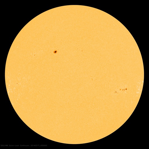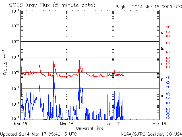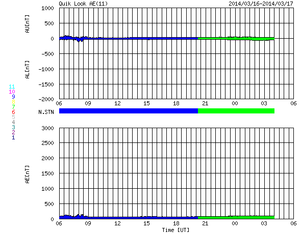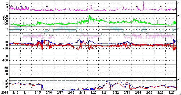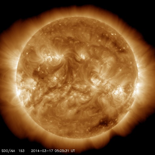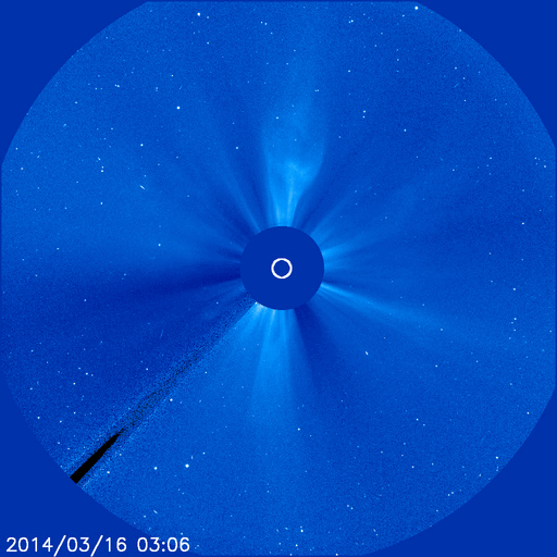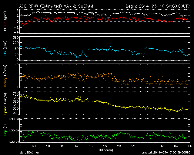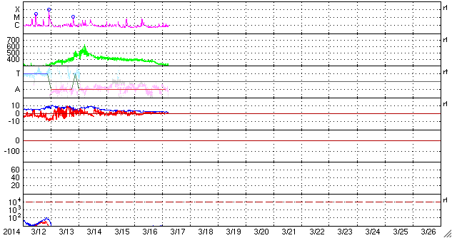 2014/ 3/17 14:40 更新 フィラメント噴出によりCMEが発生しています。太陽風は低速です。 担当 篠原 太陽の南東部(左下)で、16日12時(世界時16日3時)に、 フィラメントの噴出が発生しました。 SDO衛星AIA193の動画を見ると、 斜めに伸びていた黒い筋(ダークフィラメント)が、 勢いよく噴き出しています。 飛び出したコロナのガスはCMEとなって、 太陽から左下方向を中心に広がっています。 SOHO衛星LASCO C3の動画を掲載します。 地球からは斜め方向の噴出なので、 影響は及びにくいと思いますが、 20日頃に太陽風の弱い乱れが到来するかもしれません。 太陽では、16日15時半(世界時16日6時半)に 西の端(右端)にあった2003黒点群で C7.3と大きめの小規模フレアが発生しました。 2003群は現在は見えなくなっています。 また、この他の黒点群でC1〜2の小さいフレアが 5回ほど発生しています。 規模は小さいですが、ある程度の活動が続いています。 太陽風は、昨日から今日にかけて速度が低下して、 現在は310km/秒と低速の風になっています。 磁場強度も2〜3nTに弱まっています。 磁気圏の活動は穏やかです。 AE指数はほとんど変化していません。 SDO衛星AIA193にはコロナホールは見られず、 CMEによる乱れを除けば、 太陽風は穏やかな状態が続きそうです。