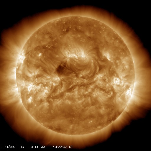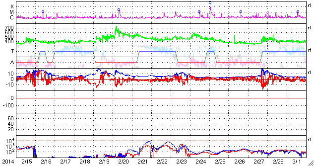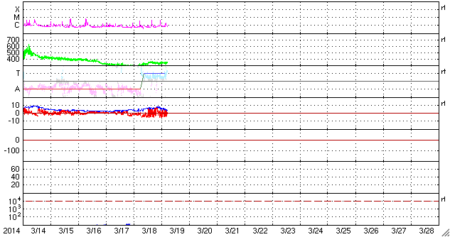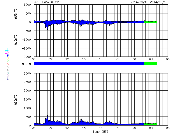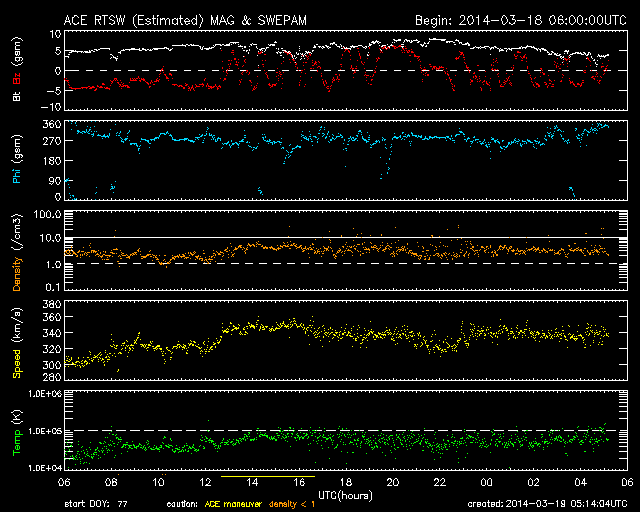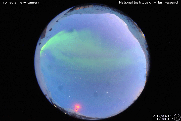 2014/ 3/19 14:14 更新 太陽風は低速ですが、磁場が南に振れてオーロラの活動も少し高まっています。 担当 篠原 太陽風の速度は、 300km/秒から340km/秒に少し上がりましたが、 低速の風が続いています。 磁場強度は、5nTと平均的な強さに戻っています。 磁場の南北成分は、 +4〜-4nTくらいの範囲で南北に振れています。 このため、磁気圏の活動度は少し高まっていて、 AE指数のグラフは小さい変化が続いています。 この中の、世界時18日20時前後の ノルウェー・トロムソのオーロラの様子を、 全天カメラの動画で紹介します。 ちょうど夕暮れの時間帯で、 オーロラの光が踊る中、青さの残る空が次第に暗くなり、 漂う雲は夕焼けに赤く染まって見えます。 初めの写真からオーロラや星が写っているので、 実際にはほとんど夜空に見えているのだと思います。 高感度なカメラならではの光景かもしれません。 春分が近づいて、 トロムソのカメラはそろそろ止まりそうです。 今期の最後の紹介になるかもしれません。 太陽は、東端の2010黒点群が一番活動的で、 昨日より、C3.4、C4.7、C4.7と、 Cクラスの小規模フレアを繰り返しています。 黒点も発達している様で、今後の活動に注目して下さい。 福岡の研究会は今日までです。 今夜鹿児島に帰り、明日からはいつもの更新ペースに戻ります。